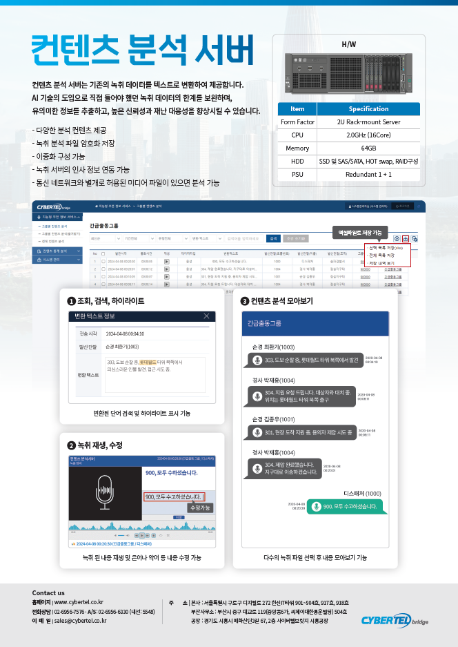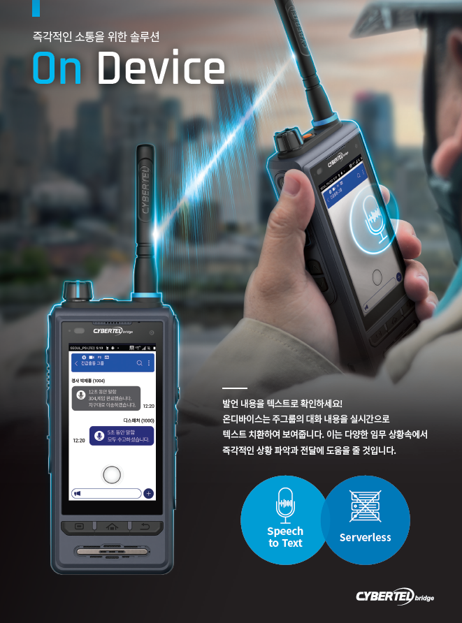 주그룹의 대화 내용을 실시간 텍스트로 치환하여 보여주는 On Device STT(Speech To Text) 솔루션은 다양한 현장 임무 상황에서 즉각적인 상황 파악에 도움을 줍니다. 또, AI 컨텐츠 분석 솔루션은 수집된 방대한 녹음 데이터를 AI 텍스트 변환하여 키워드 기반으로 검색을 지원하는 등 저장된 데이터의 가치를 높이고 업무 효율을 대폭 상승시킵니다.