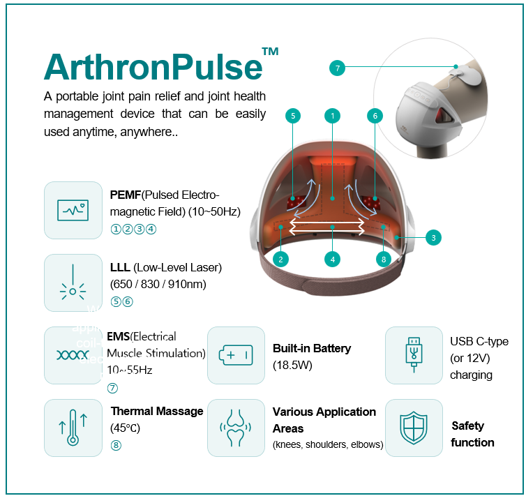 ArthronPulse generates ultra-low frequency electromagnetic fields to decrease pro-inflammatory factors and increase cell division growth factor to rapidly repair inflammation in cartilage, and is also a cordless, wearable device of three-wavelength, low-level laser treatment, which helps cells recover and heal faster.
