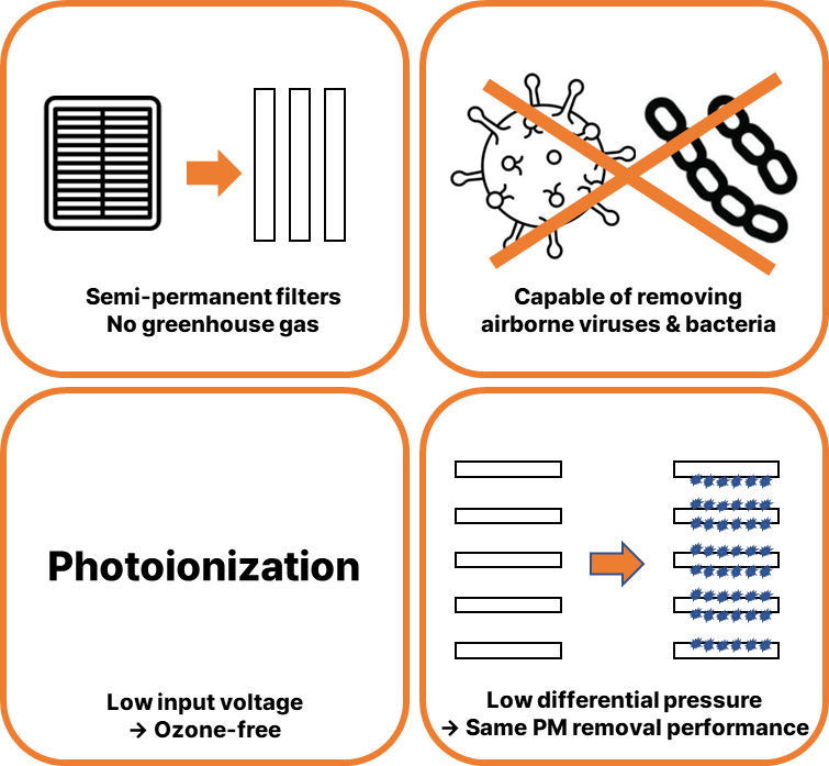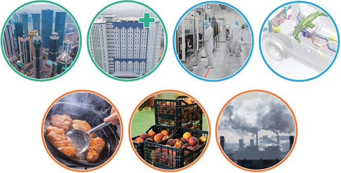 - Multi-use facilities, residential facilities, hospitals (medical facilities), facilities for sensitive groups, industrial facilities (indoors: clean rooms, plants), industrial facilities (outdoors: fine dust, greenhouse gas), mobility (cars, trains, ships, airplanes, etc.), improvement of the cooking environment (removing cooking fumes), storage and distribution of food ingredients (freshness solutions)