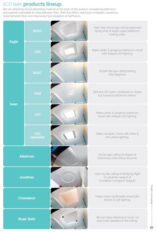 Ecobas products express a luxurious bathroom with a variety of designs and surface finishes. Consumers can choose the ceiling shape they want from designs such as dome, flat, and well. The high-gloss finish of the raw material allows it to be used for a long time without discoloration even in the special environment of the bathroom without any additional work.