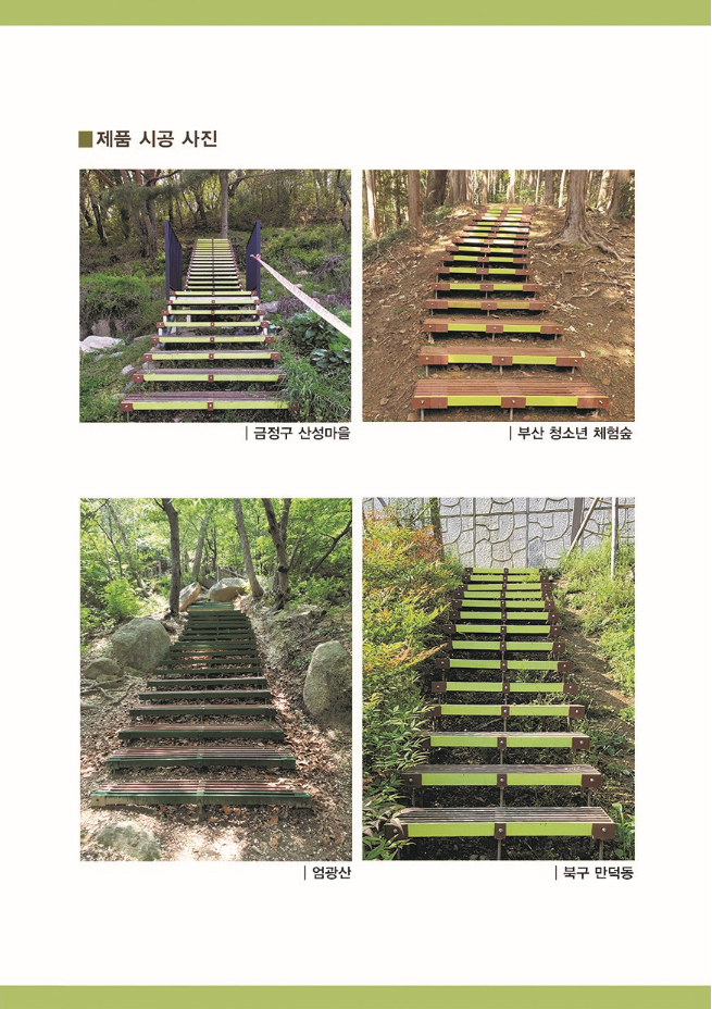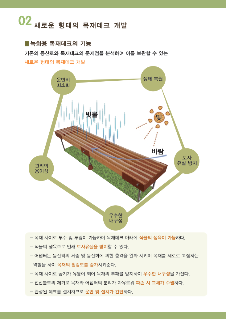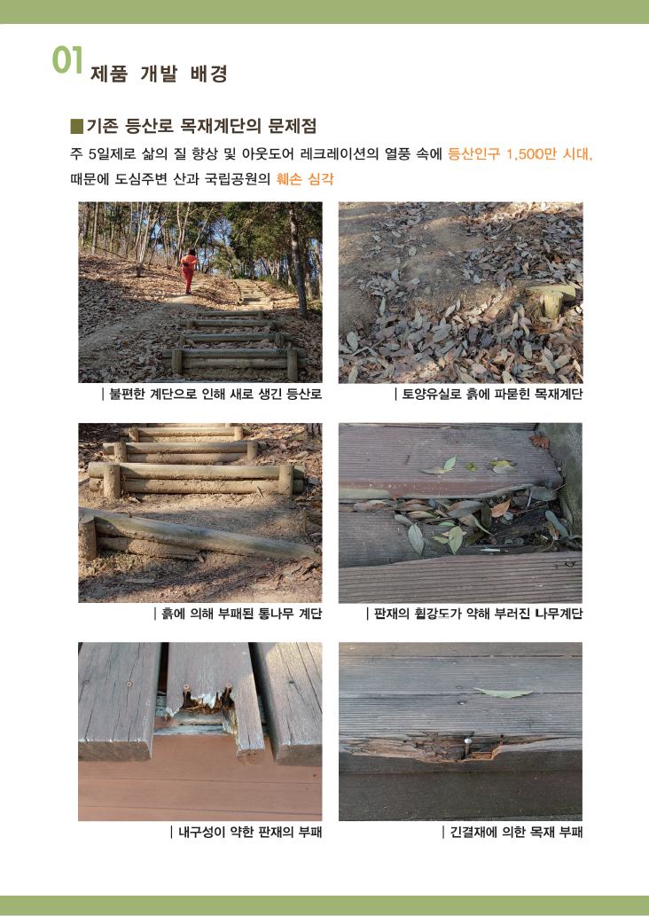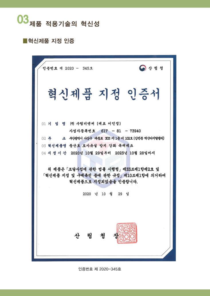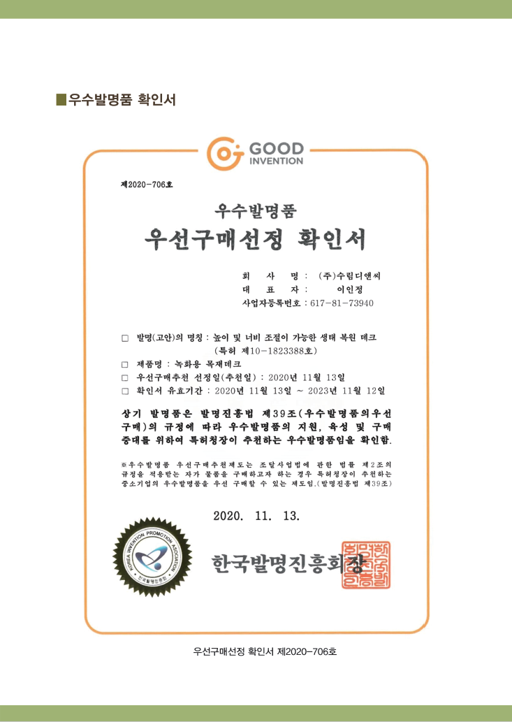 수림디앤씨를 한마디로 정리하면 환경을 생각하며 연구를 중심으로 하는 친환경 회사입니다. 저희 수림D&C는 친환경 기업으로서 생태 복원 사업과 목재 데크 사업을 하고 있습니다. 저희 수림 디앤씨는 기업 부설 연구소를 운영하면서 특허와 디자인을 출원하고 설계를 통한 제품을 생산하고 있는 회사입니다. 녹화용 목재데크는 목재를 두께 방향으로 세워 배열하였기 때문에 힘 강도를 증진하고 내구성도 높였습니다. 그리고 아울러 목재 사이 갭으로 인해서 빛과 공기가 유통되어 목재의 부패를 막을 수 있어 사용 연수도 늘어나게 됩니다. 제픔을 보시는 것과 같이 목재가 각각 결속되어 있어 훼손 시 교체가 용이하고 관리가 편한 장점이 있습니다. 등산로의 훼손을 최소화 할 수 있으며 자연과 공존할 수 있는 제품으로 저희 제품은 지장성이 밝다고 생각합니다. 저희 수림디앤씨는 목재 데크 뿐만 아니라 앞으로 사람과 자연이 함께 할 수 있는 제품을 꾸준히 연구 개발하여서 대한민국 목질 산업의 대표적인 친환경 기업으로 나아가겠습니다.