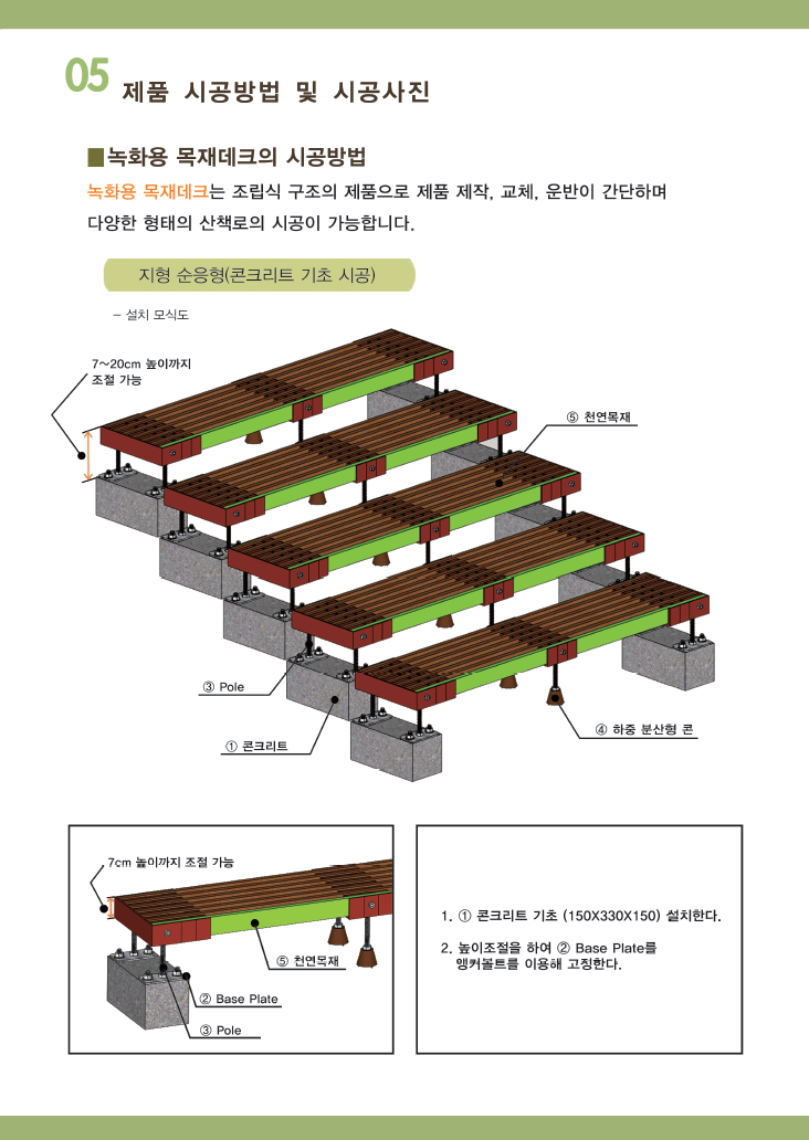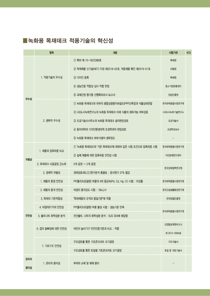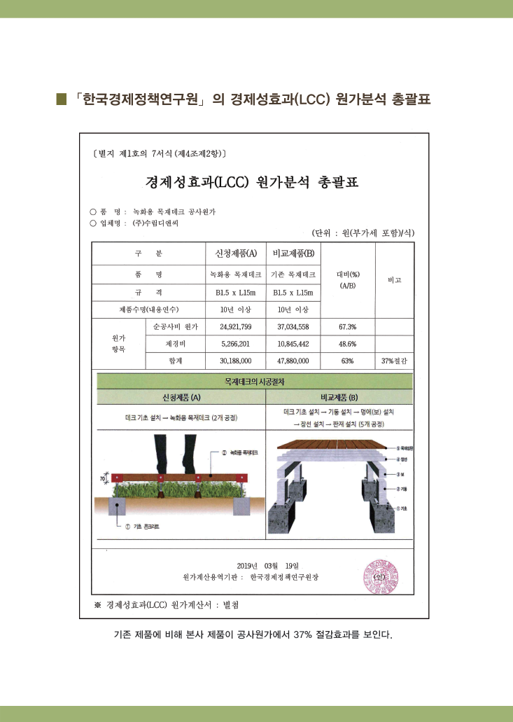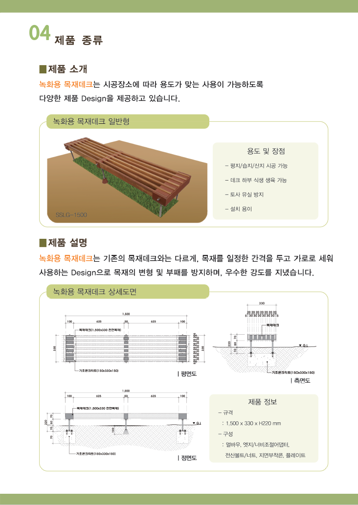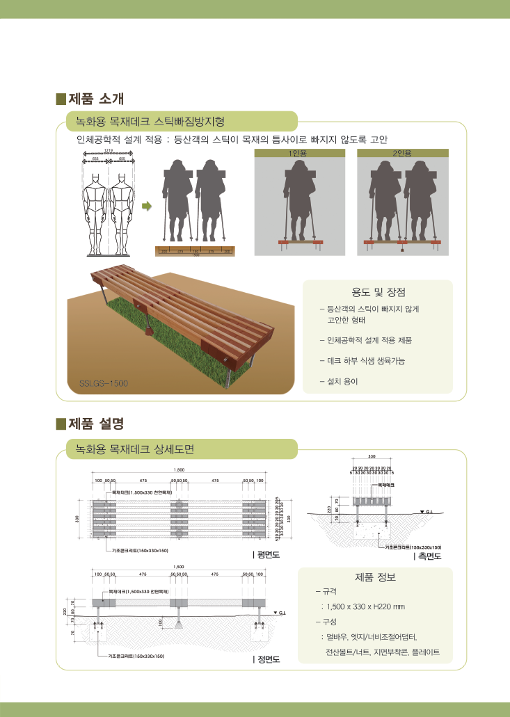 수림디앤씨를 한마디로 정리하면 환경을 생각하며 연구를 중심으로 하는 친환경 회사입니다. 저희 수림D&C는 친환경 기업으로서 생태 복원 사업과 목재 데크 사업을 하고 있습니다. 저희 수림 디앤씨는 기업 부설 연구소를 운영하면서 특허와 디자인을 출원하고 설계를 통한 제품을 생산하고 있는 회사입니다. 녹화용 목재데크는 목재를 두께 방향으로 세워 배열하였기 때문에 힘 강도를 증진하고 내구성도 높였습니다. 그리고 아울러 목재 사이 갭으로 인해서 빛과 공기가 유통되어 목재의 부패를 막을 수 있어 사용 연수도 늘어나게 됩니다. 제픔을 보시는 것과 같이 목재가 각각 결속되어 있어 훼손 시 교체가 용이하고 관리가 편한 장점이 있습니다. 등산로의 훼손을 최소화 할 수 있으며 자연과 공존할 수 있는 제품으로 저희 제품은 지장성이 밝다고 생각합니다. 저희 수림디앤씨는 목재 데크 뿐만 아니라 앞으로 사람과 자연이 함께 할 수 있는 제품을 꾸준히 연구 개발하여서 대한민국 목질 산업의 대표적인 친환경 기업으로 나아가겠습니다.