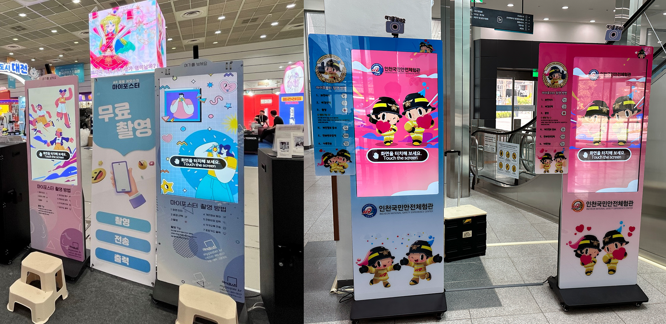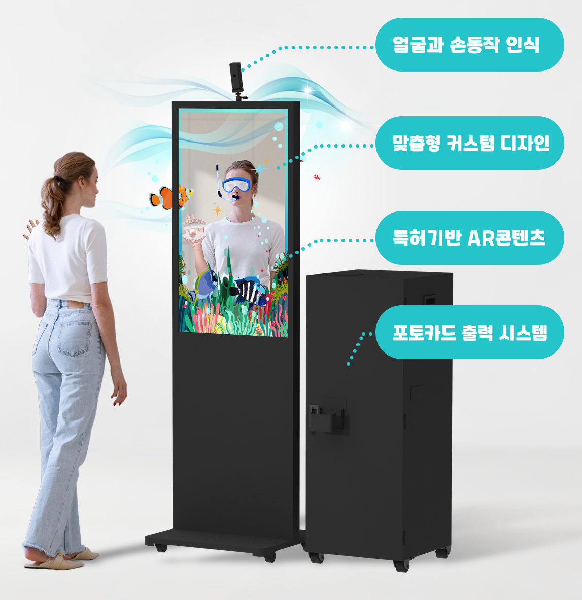 영화관, 관광지, 박물관, 놀이공원 등 이벤트 및 행사 현장에서 쉽고 재미있게 즐길 수 있는 AR 포토 키오스크입니다.