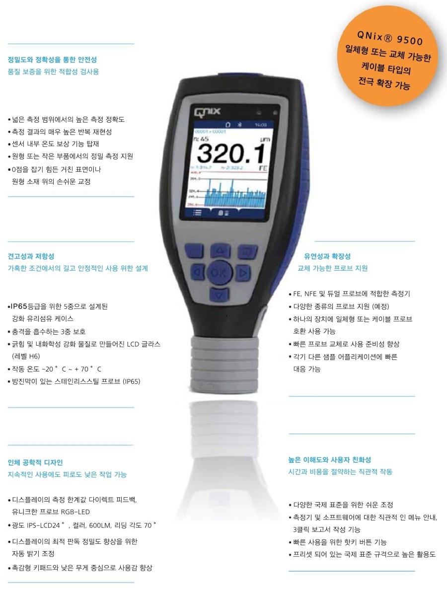 QNix 의 다른 코팅 두께 측정기와 마찬가지로 견고하고 정확하며 다목적이며 이해하기 쉽고 다루기 쉬운 QNix® 9500 은 최신의 기술을 측정 게이지에 접목했으며, 가능한 많은 측정 어플리케이션에 대한 다양한 요구 사항을 충족시킬 수 있도록 최선을 다했습니다.