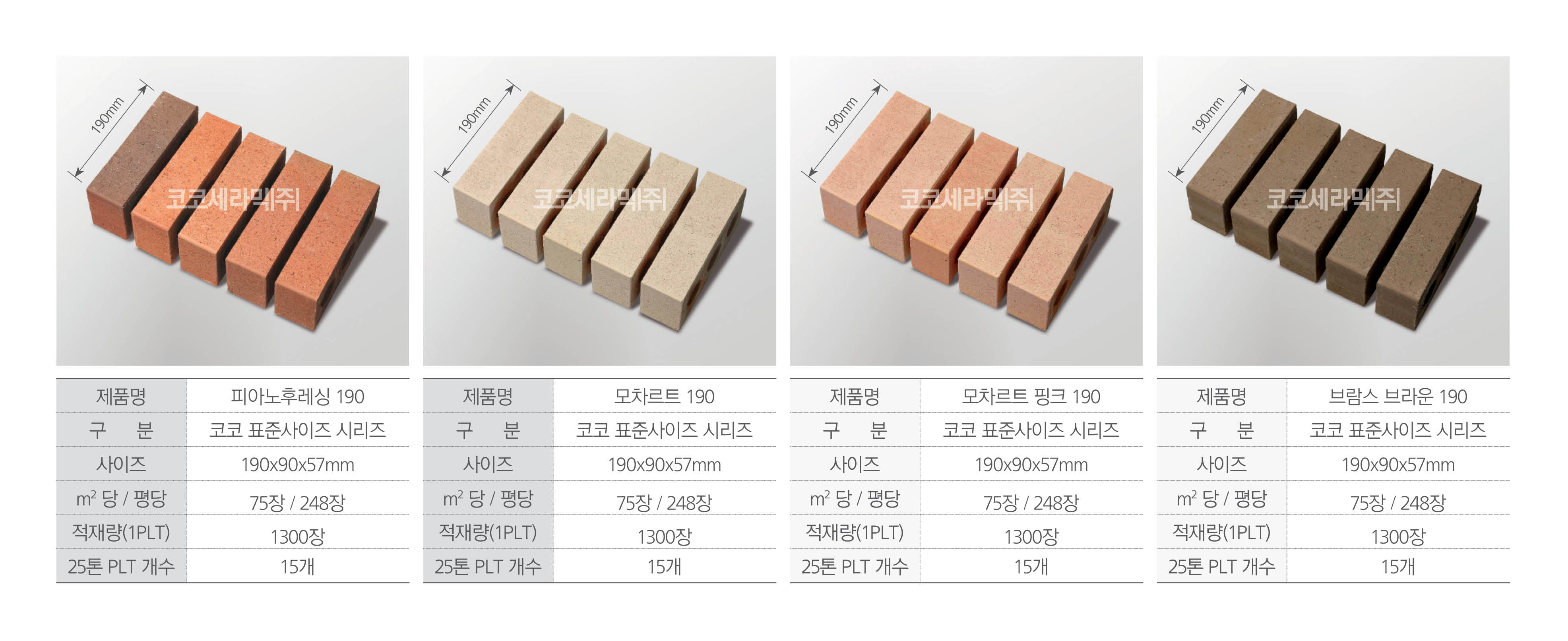 코코세라믹(주) 모차르트 190 학교건물 시공사례 모차르트 190로 지은 학교건물 뒤쪽 모습 건물 측면사진 (코코 190시리즈 벽돌, 모차르트190) 모차르트 m2당 75장 구분 코코 표준사이즈 시리즈 사이즈 190x90x57mm m2당 / 평당 75장 / 248장 적재량(1PLT) 1300장 25톤 PLT 개수 15개 코코 190 시리즈벽돌, 첼로 20 학교건물 시공사례 첼로20으로 지은 학교건물 뒤쪽 모습 알록달록한 특유의 벽돌색상이 돋보이는 첼로20 첼로20 m2당 75장 구분 코코 표준사이즈 시리즈 사이즈 190x90x57mm m2당 / 평당 75장 / 248장 적재량(1PLT) 1300장 25톤 PLT 개수 15개 코코세라믹(주) 세울 벽돌전시장