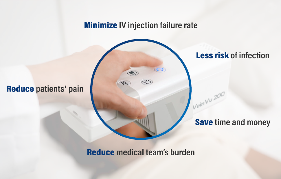 It is a non-invasive device that uses Near-Infrared (NIR) light to illuminate the skin and project an image to visualize the blood vessel. It shows veins with the same thickness as the actual blood vessels on the skin surface, realizing real-time observation.