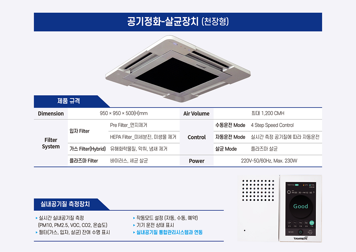 ◦ 공기정화, 공기살균, 공기질 측정, 청정환기, 원격제어, 원격감시 기능이 일체화 된 다중이용시설 전용 제품