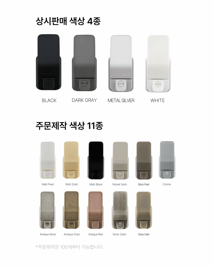 3) 마감 : 도금(칼라 : 크롬, 골드 무광, 블랙펄, 진주무광, 니켈세틴, 앤틱실버, 실버새틴, 엔틱레드, 엔틱골드, 황동 새틴)