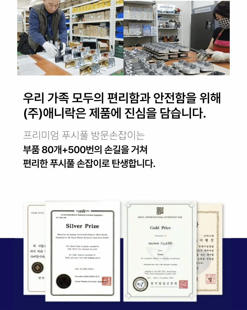 (주)애니락의 '배리어프리 푸시풀 방문 손잡이'는 유니버설 디자인에 편리한 기능과 인테리어 디자인 감각을 더욱 돋보이게 합니다. 제품의 특징은 '손가락 하나로 부드럽게 열리는 배리어프리 기능으로, 손목에 힘이 약한 어린이, 고령자, 장애인, 몸이 불편한 성인 모두 편리하게 사용할 수 있습니다.