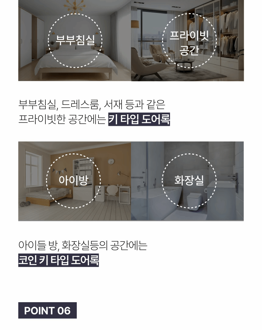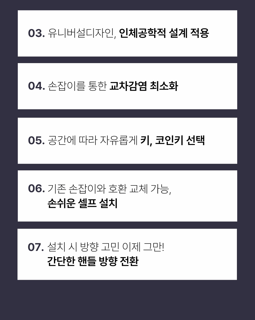 6) 차별점 : 세계 표준 규격으로 무타공, 셀프 설치 / 보안키, 코인키 옵션 / 원스탭 기능