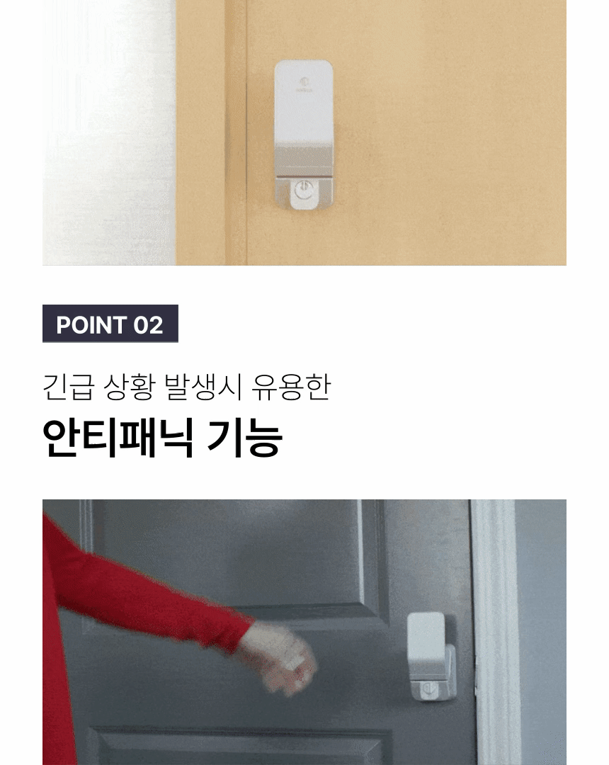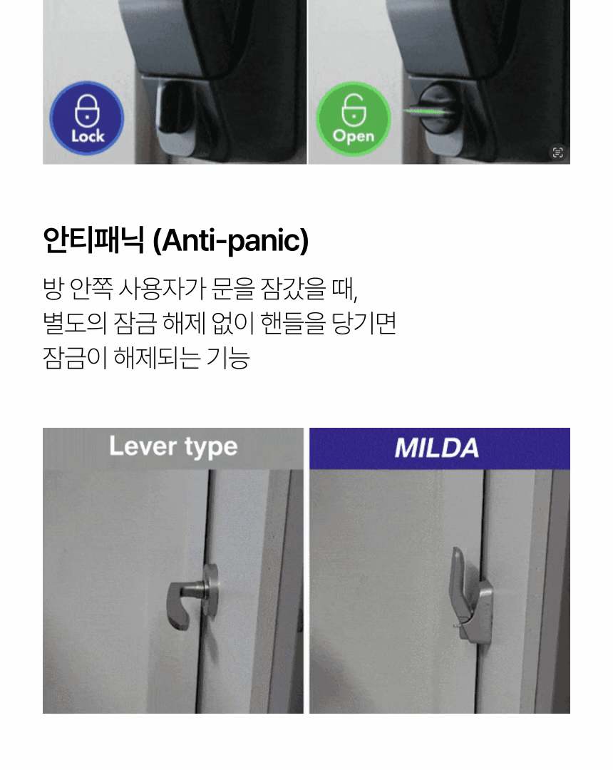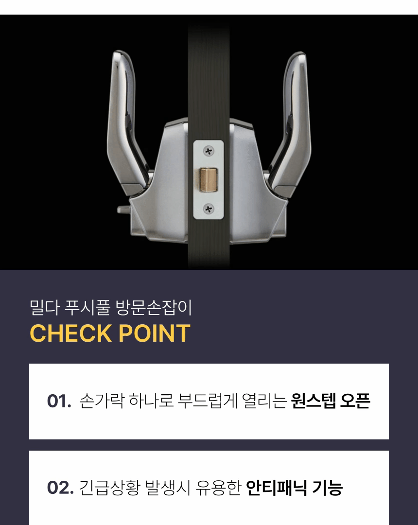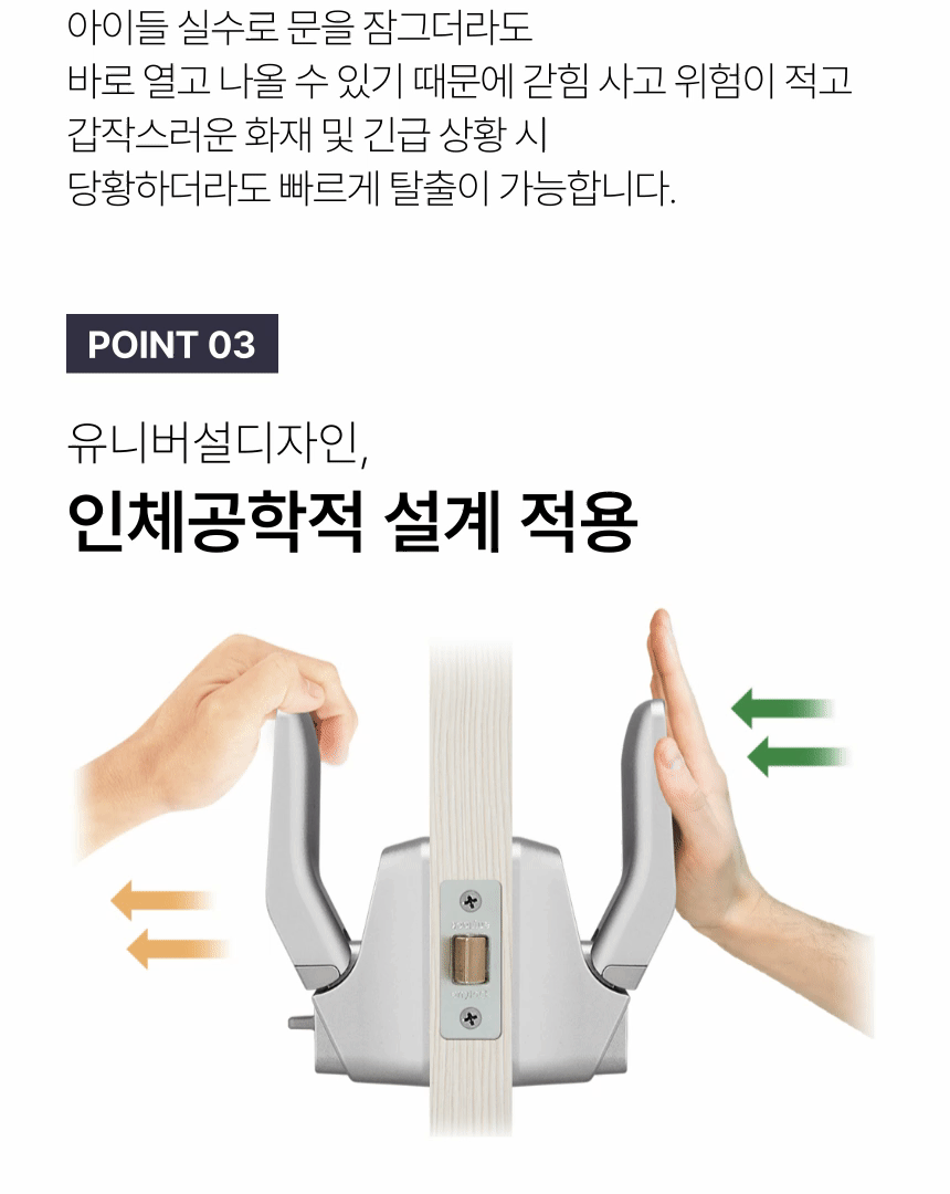 안티패닉(방 안쪽 사용자는 핸들만 당기면 락이 해제되는 기능) / 방향 전환 기능(밀고 당기는 방향전환)