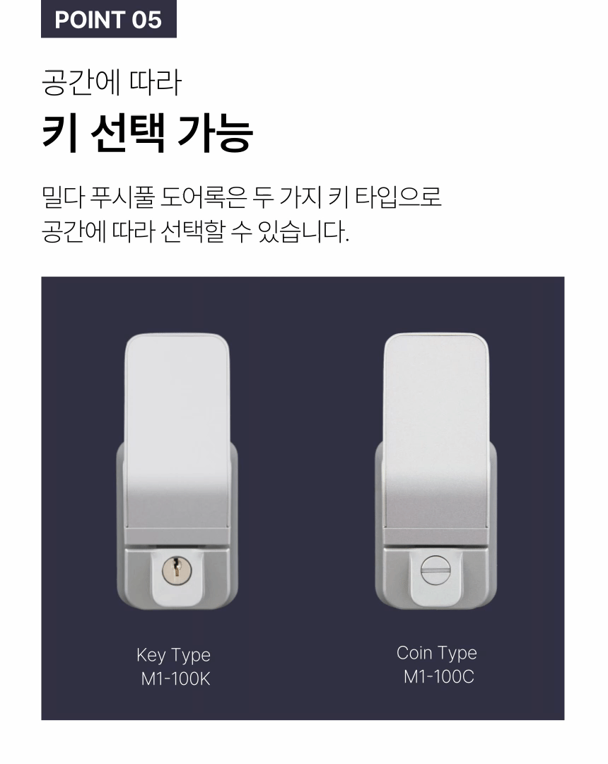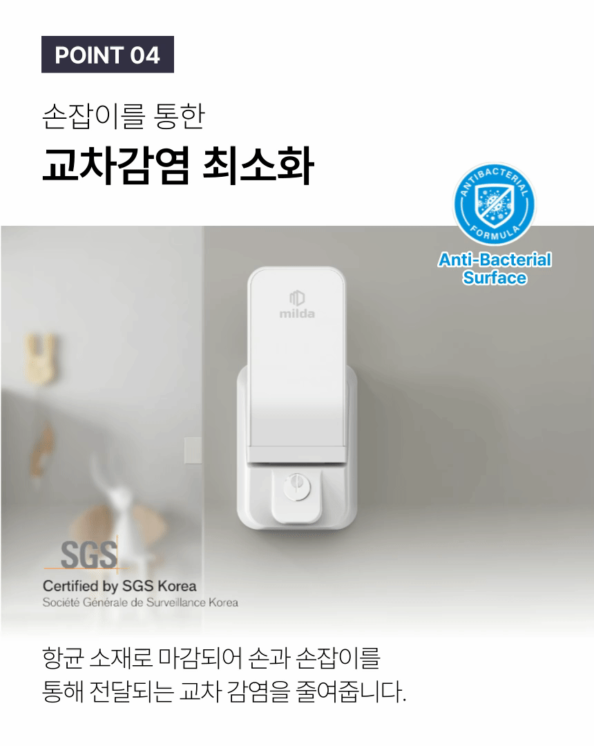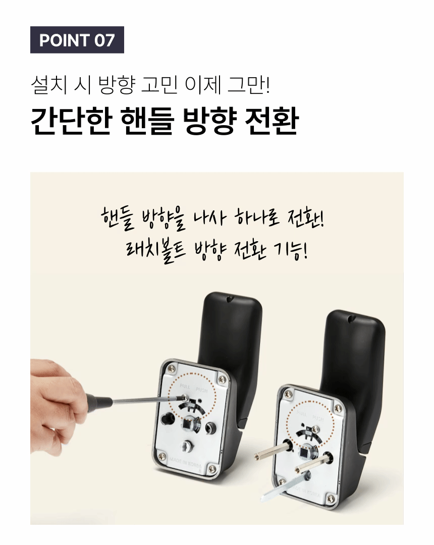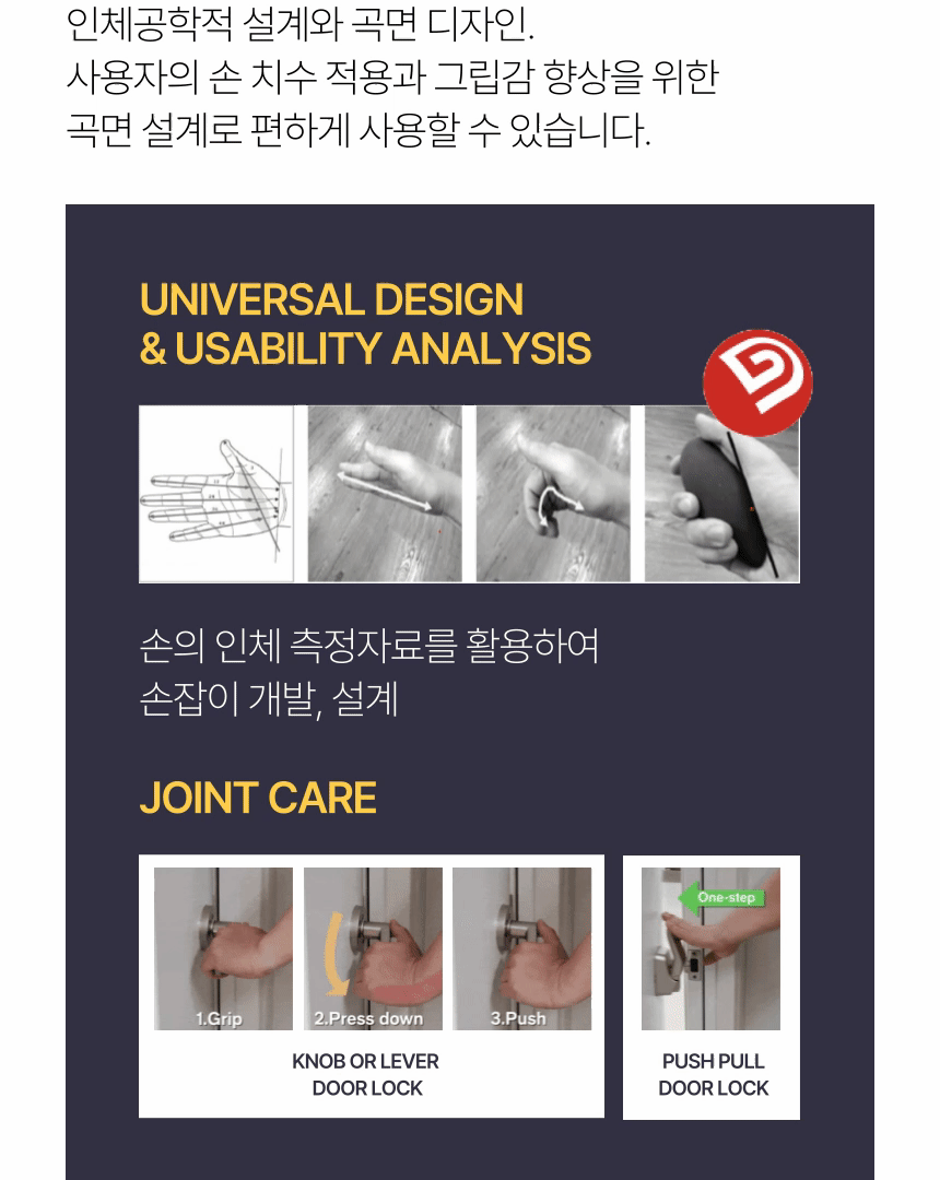 안티패닉(방 안쪽 사용자는 핸들만 당기면 락이 해제되는 기능) / 방향 전환 기능(밀고 당기는 방향전환)