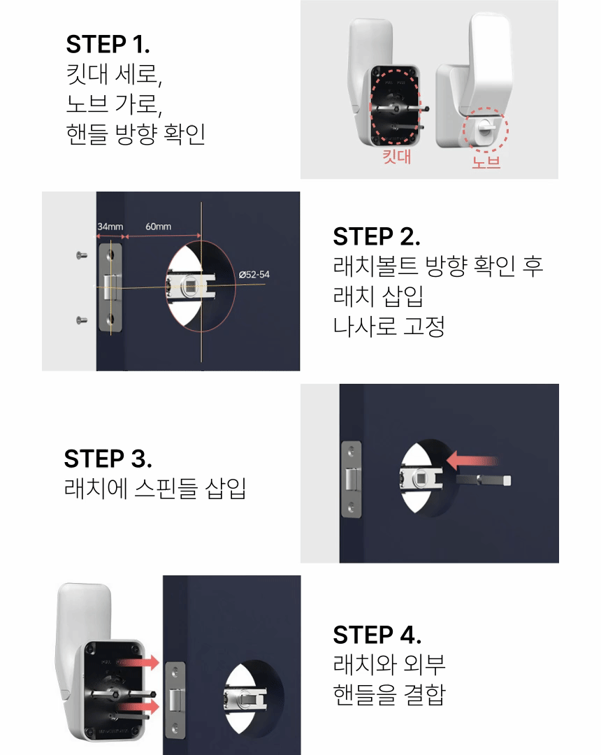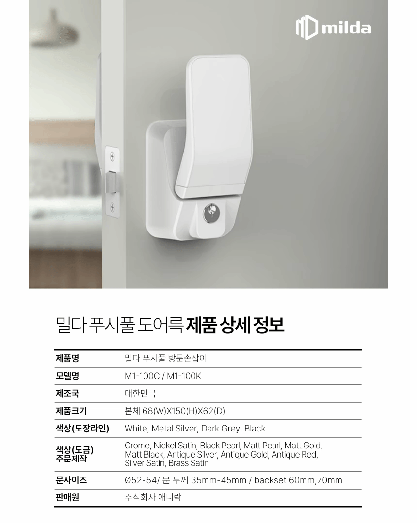 또한 본 제품은 문에 흠집을 내지 않습니다. 표준규격에 호환되어 무타공에 3분 설치가 가능합니다.