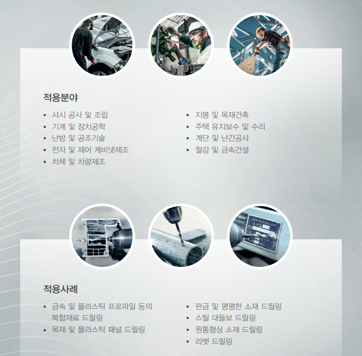 또한 복합소재나 아크릴, 알루미늄 합판, 스테인레스 스틸판 가공시에도 쉽게 드릴링이 가능합니다.