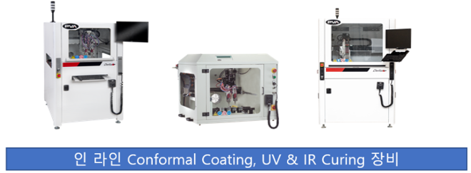 절연, 방습, 방진 등으로부터 PCB, SMT & Package를 보호하고 장기 신뢰성을 확보하기 위해 실리콘, 아크릴 및 우레탄 코팅제를 자동 도포하는 PVA 컨포멀 코팅 장비로서 인 라인 장비로서, 로더 – 컨포멀 코팅 – UV 검사 – UV & IR 경화 – PCBA 반전 – 언 로더로 구성된다.
