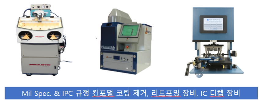 PCB & Package에 적용되었던 실리콘, 아크릴, 우레탄, 에폭시 등의 컨포멀 코팅, 몰딩 및 인켑슐레이팅 재료를 손상 없이 제거하거나, 폴리싱, 피니싱, 페인트 제거, 도금제거, 버 제거할 수 있는 다양한 용도를 가진 마이크로 샌드 브라스팅 장비, Mil Spec. & IPC 규정에 의한 방산(육.해.공), 철도, 항공, 선박 및 의료기기 탑재 용 전자 반도체 부품의 리드를 포밍, 트리밍 & 커팅하는 장비, IC Package의 테스트 및 Error 검증을 위해 Wafer 및 Gold Wire 상태를 보기 위해 디켑하는 장비이다.