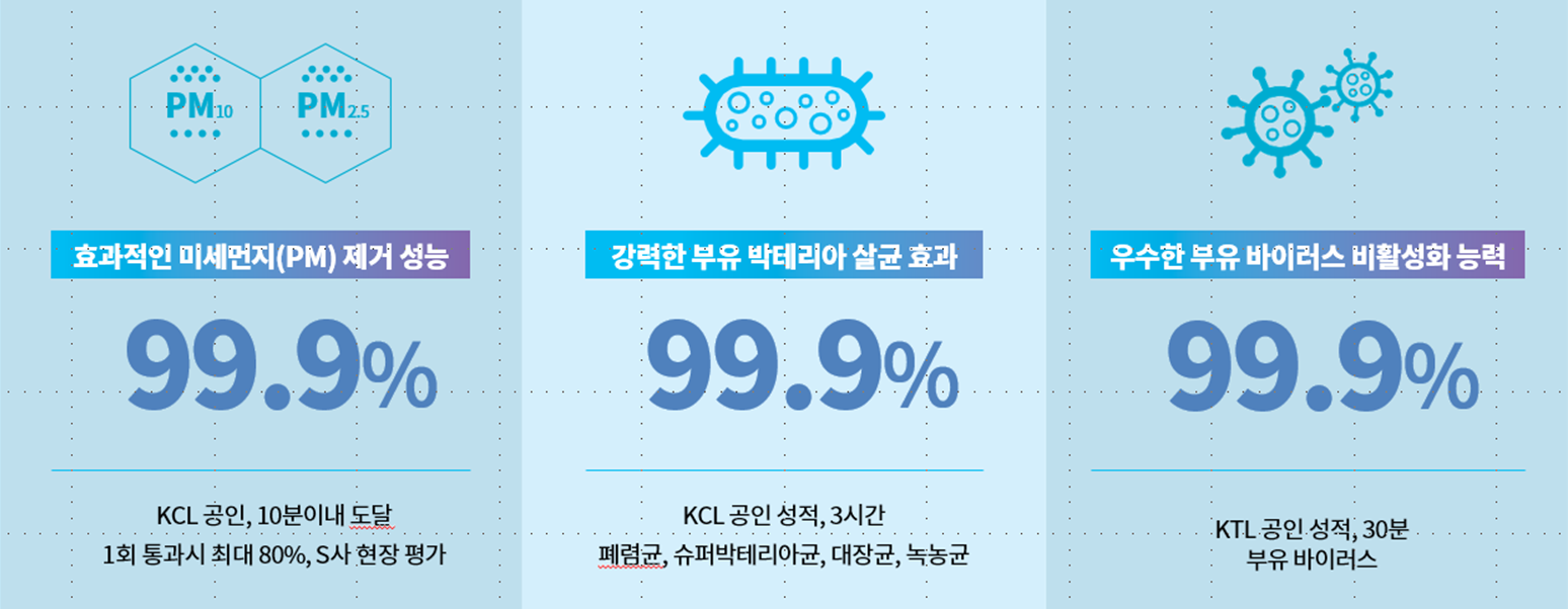 이러한 원리를 이용하여 1회 통과 시 최대 80%의 미세먼지 제거 효과가 있으며, 밀폐 공간에서 10분간 작동하는 경우에는 99.9%의 미세먼지를 제거하는 효과를 입증한 바 있습니다.