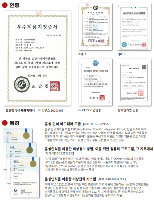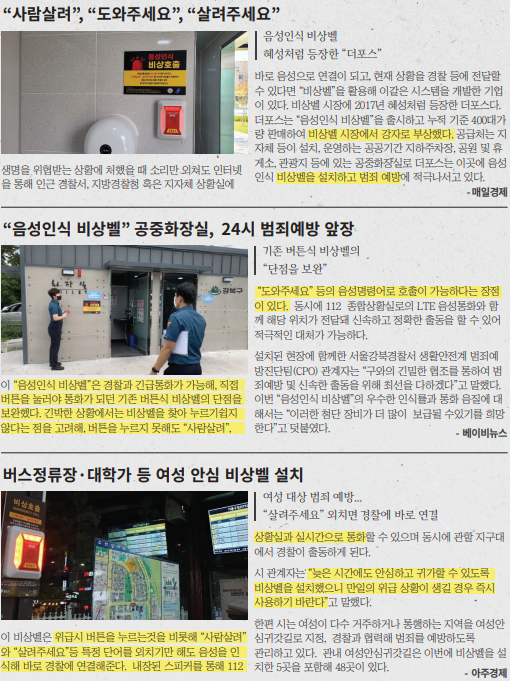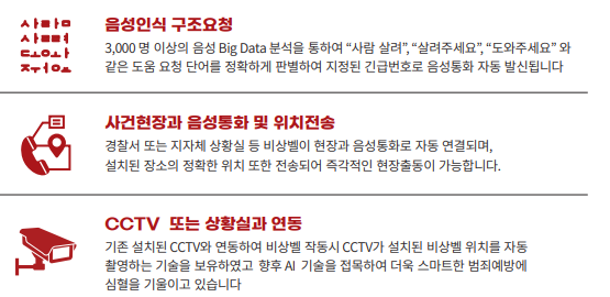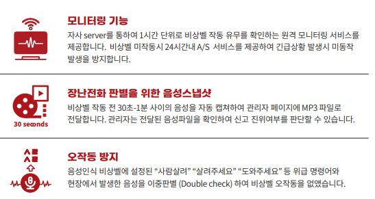 "사람살려" / "살려주세요" / "도와주세요"* CCTV가 설치될 수 없는 공중화장실 및 범죄 우범지역에 설치되어 음성 명령어로 비상벨이 작동합니다.