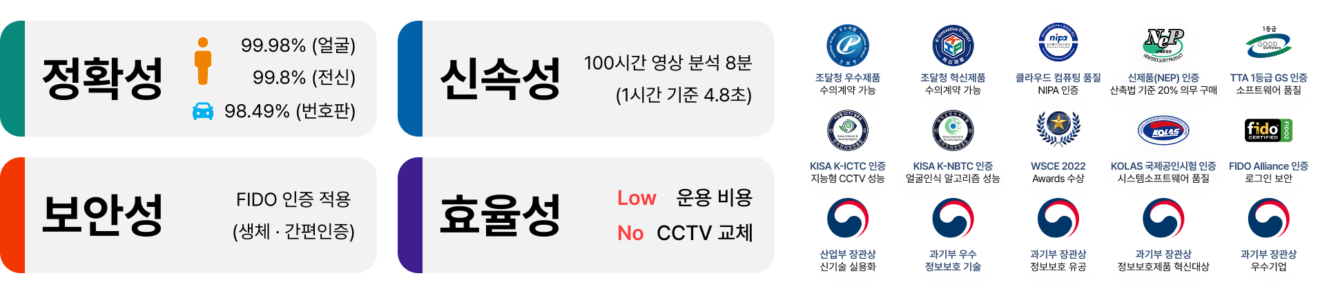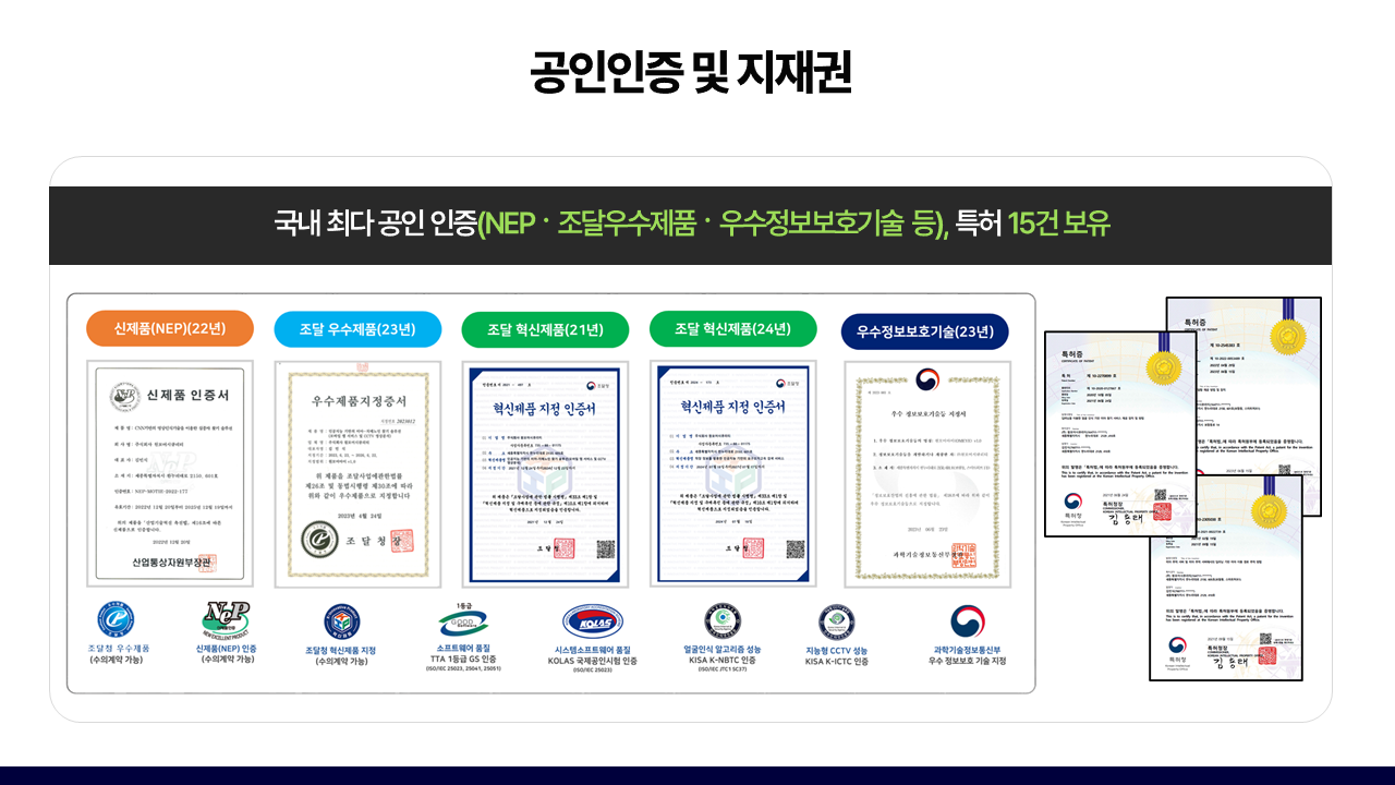 - K-NBTC(얼굴인식 알고리즘 성능) / KISA - GS 1등급(소프트웨어 품질) / TTA - 시험성적서(시스템·소프트웨어 품질) / KOLAS - 우수제품 / 조달청 - 혁신제품 / 조달청 - NEP 신제품 / 산업통상자원부