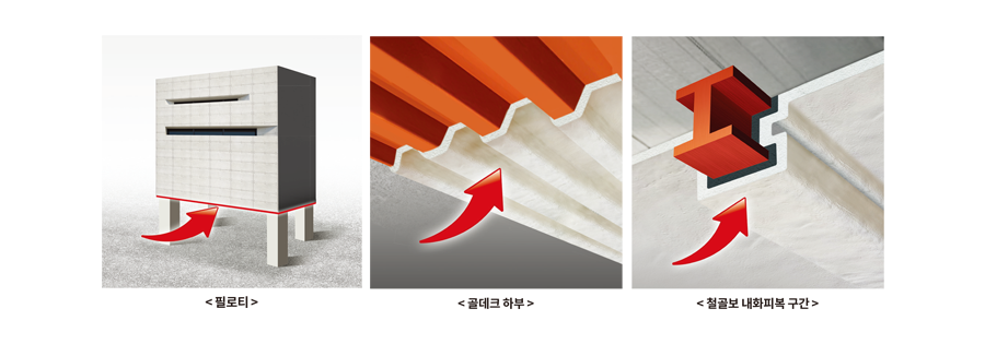 | 적용부위 | 필로티, 내부 천장, 벽체, 철골보, 골데크 등 준불연/난연재료 성능이 필요한 모든 구간