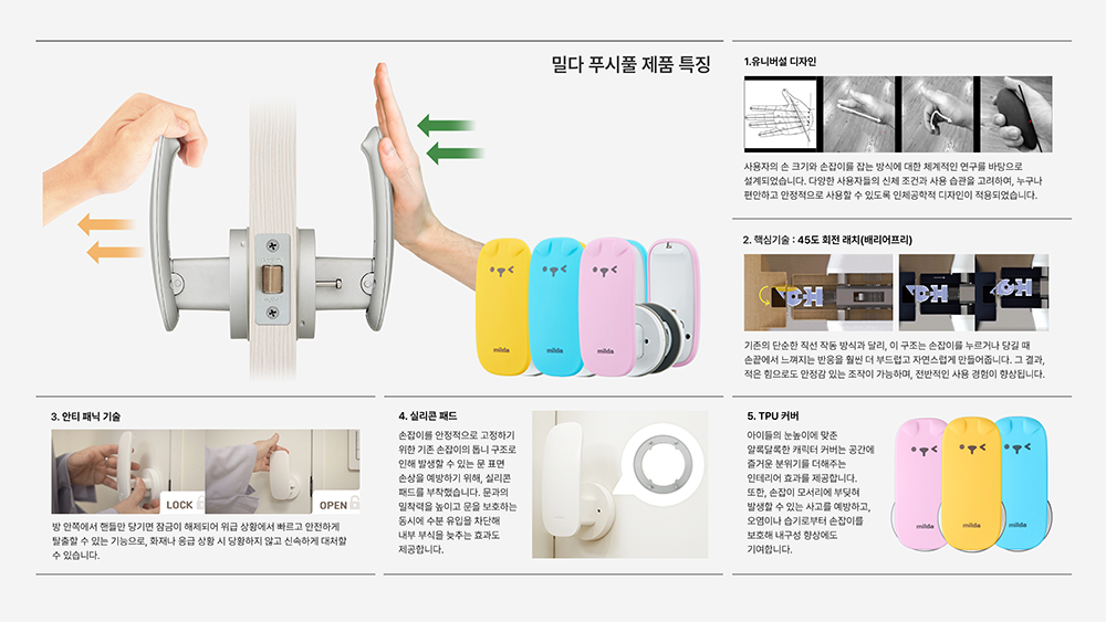 슬림한 디자인의 푸시풀 손잡이로, 키가 작은 아이들은 핸들 아래방향으로 설치하여 편리하게 사용할 수 있습니다.
