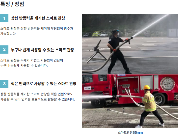 스마트 관창은 고압의 방수시 반동력에 의한 진압대원의 체력소모 및 부상위험을 방지하기 위해 개발된 장비입니다.