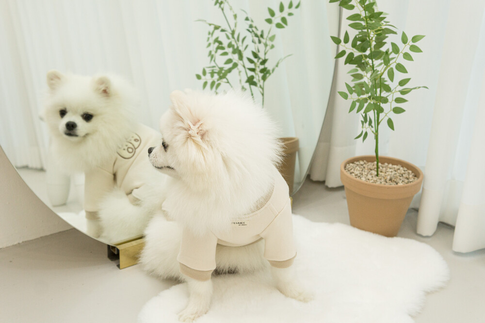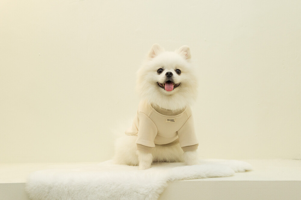 밍밍이는 겨울을 준비하며 털뚠뚠이가 되어서 넉넉하게 L 사이즈를 입었습니다 (포메라니안, 3.7kg, 평소 M사이즈)