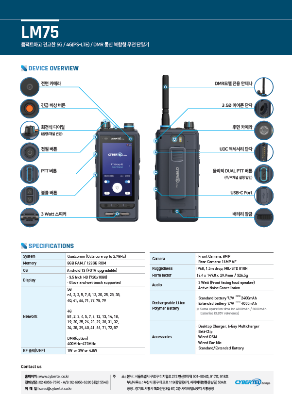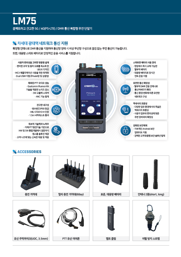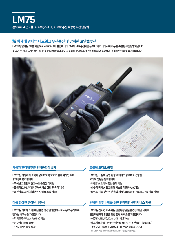 LM75는 5G 기반으로 4G(PS-LTE)뿐만 아니라 DMR(UHF) 통신기술까지 하나의 디바이스에 통합한 복합형 무전 단말기입니다. 공공기관, 치안, 국방, 철도, 의료 등 다양한 환경에서 최적화된 보안 솔루션을 제공하여 고객의 안전 확보를 지원합니다.