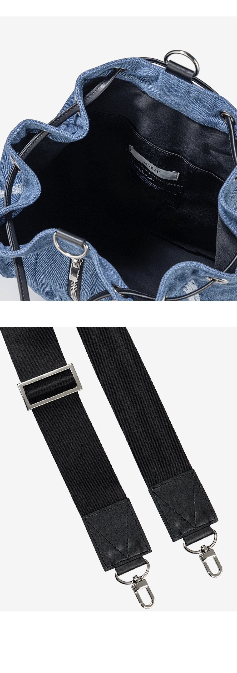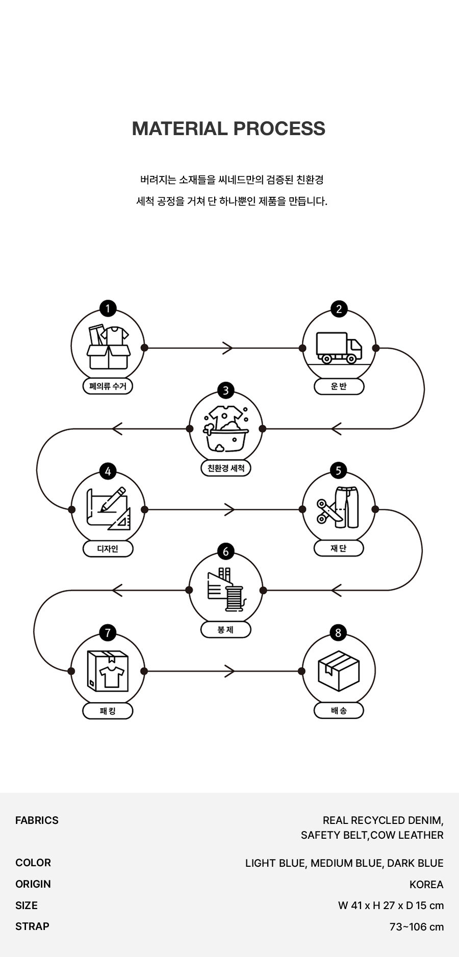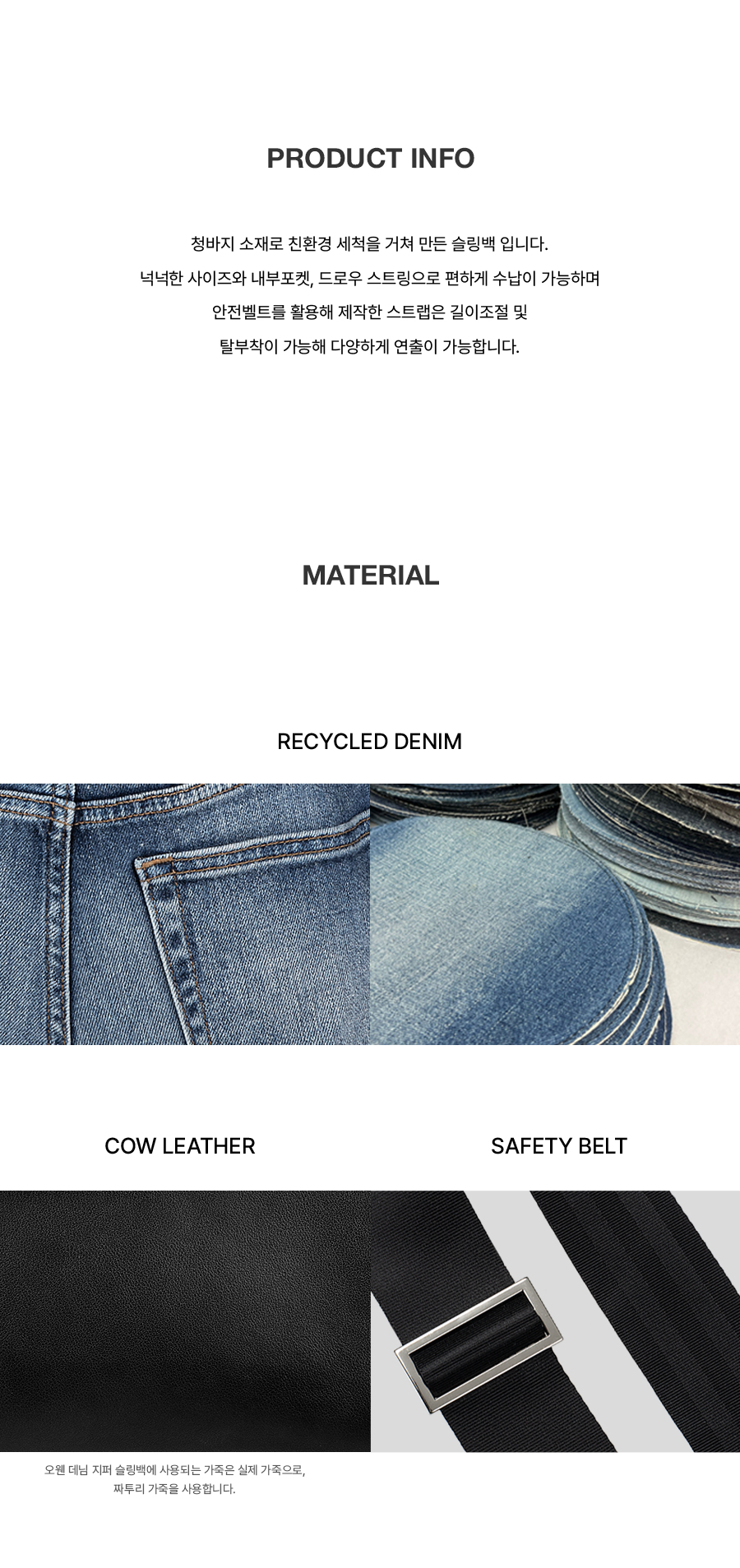 청바지 소재와 안전벨트를 활용한 스트랩을 사용한 슬링백