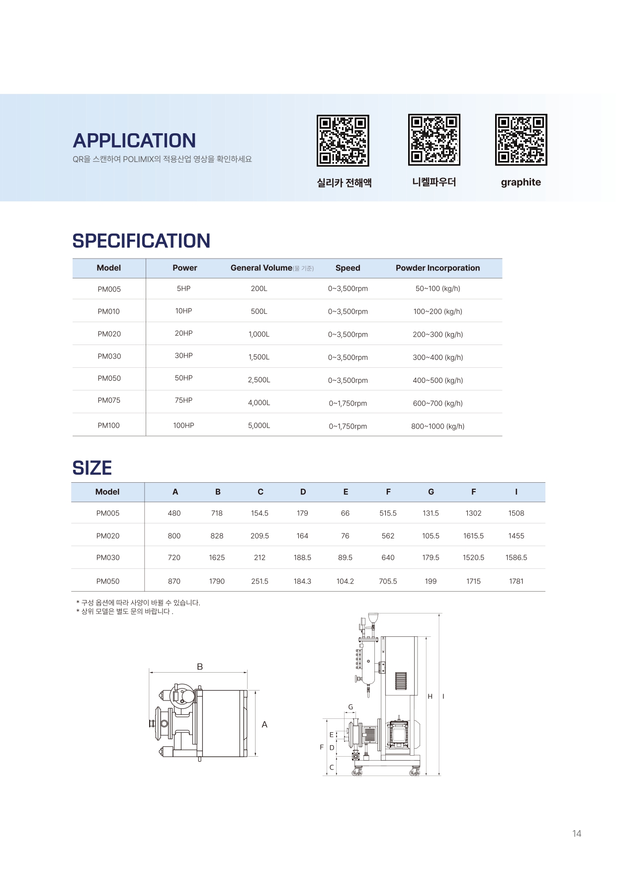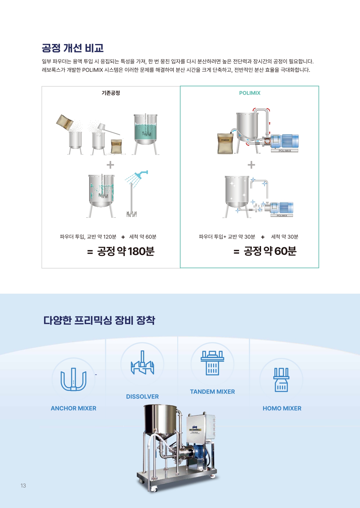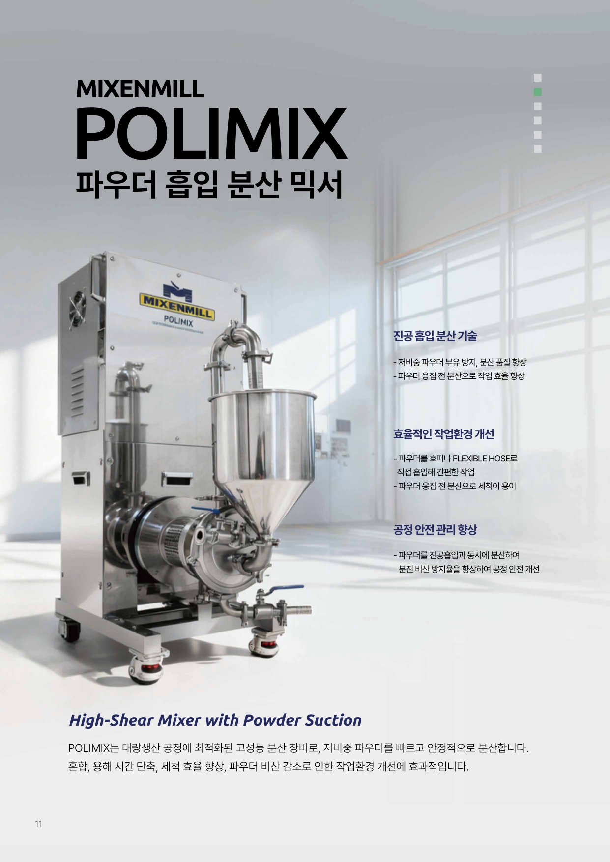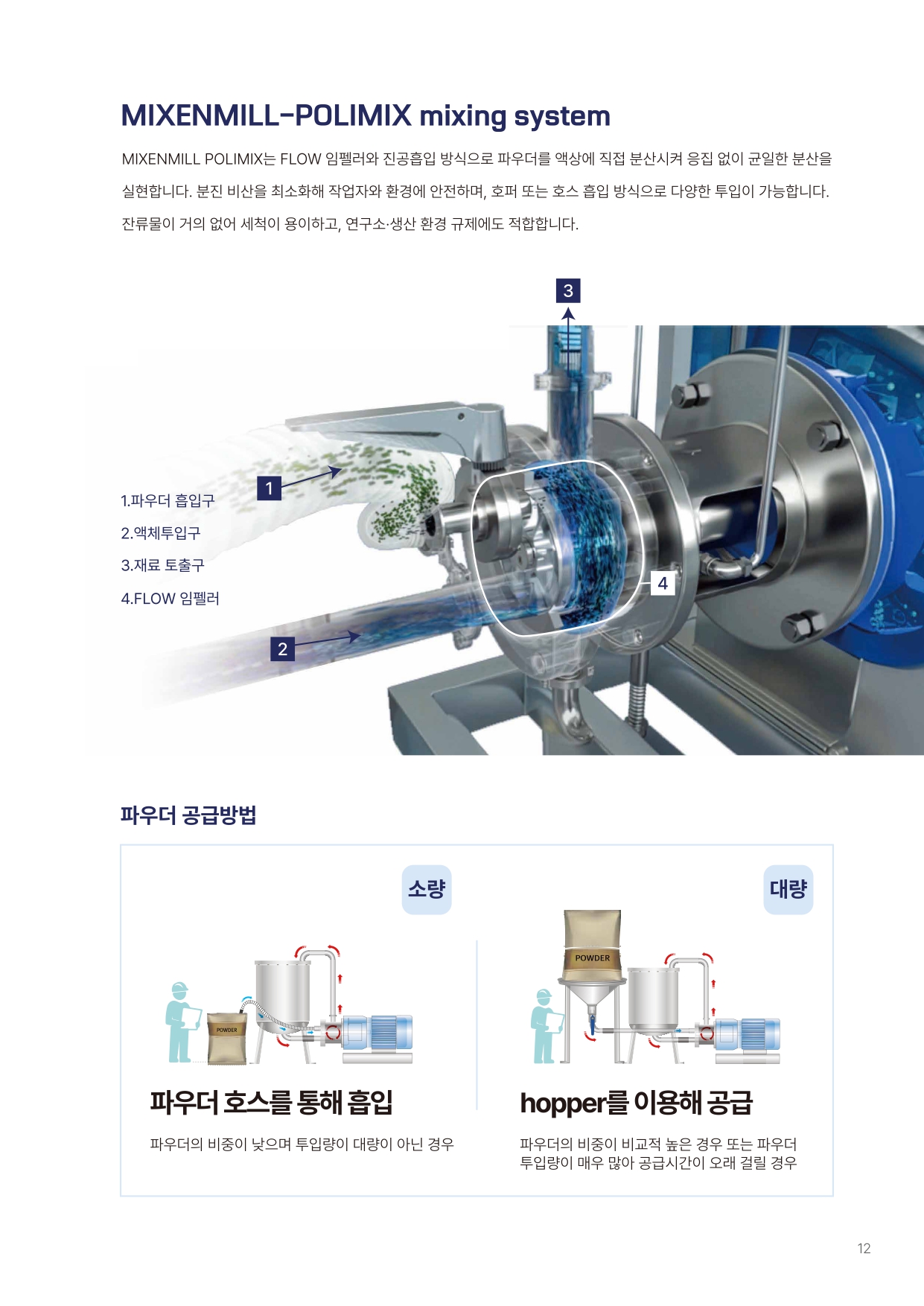 연구 및 생산 환경개선 뛰어난 분산효과(흡입과 분산을 동시에) 분산공정 단축 INLINE MIXER에 파우더 흡입 장치를 조합하여 비중이 적은 파우더와 액상의 혼합에 가장 적합하도록 설계 고속회전 하며 용액을 빠른 속도로 순환시키면 CHAMBER안에서 음압(진공)이 발생 CHAMBER에 연결되어 있는 파우더 흡입구를 열면 진공청소기처럼 파우더를 빨아들여 액상에 직접 분산 펌핑과 순환에 의한 분산을 반복하여 엉김이 없는 완벽한 분산 별도의 진공펌프 없이 심플한 구성만으로 흡입과 분산까지 신속하게 해결 POLIMIX는 전체 파우더 분산 시간을 크게 줄이고 분산효율은 대폭 상승시켜 세척시간 감소 비중이 있는 파우더의 분산 공정에도 사용할 수 있으며 옵션으로 호퍼나 탱크를 파우더 투입구에 연결하여 보다 편리하게 사용 비산이 많거나 액상에 직접 투입하였을 때 엉기는 성질이 있는 파우더를 사용하는 공정에서 아주 효과적 실리카 계열 파우더나 알루미나, 지르코니아, 카본블랙 파우더 등 까다로운 공정에 강점 KGMP을 뛰어 넘어 유럽기준인 EUGMP 제조 위생환경에 대한 요구가 크게 높음