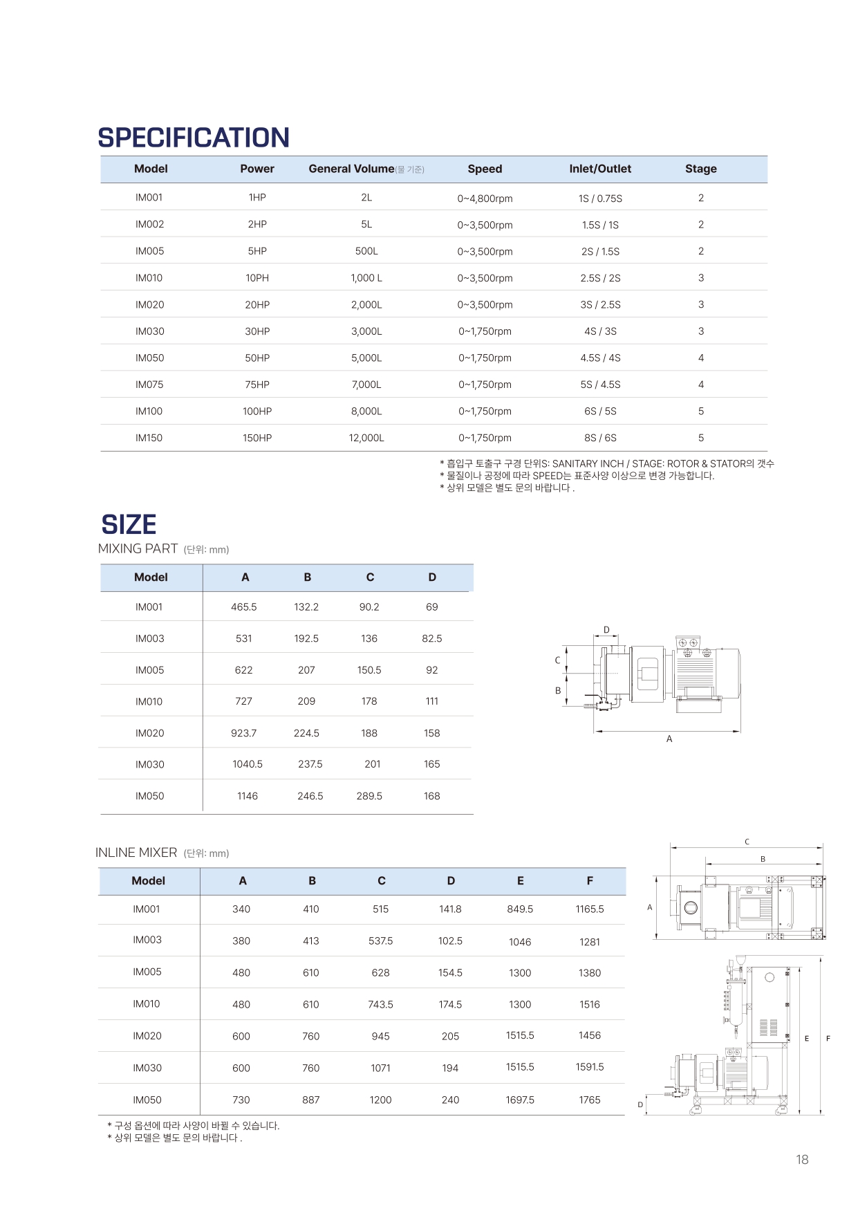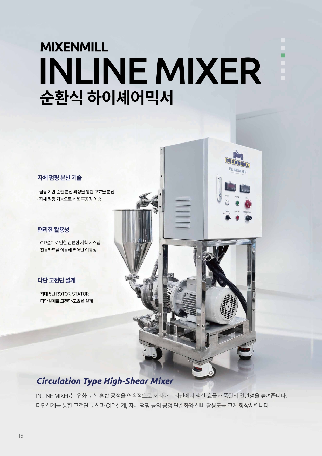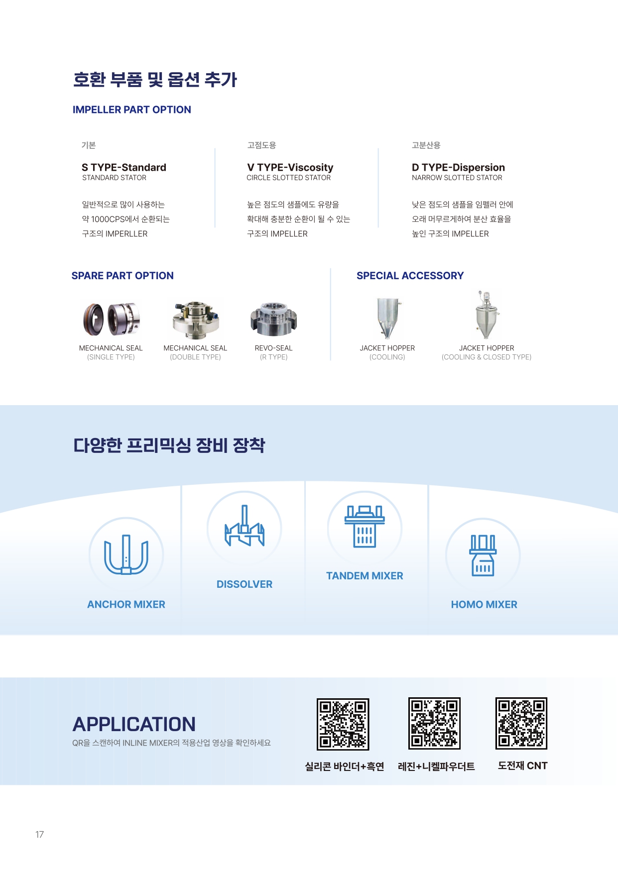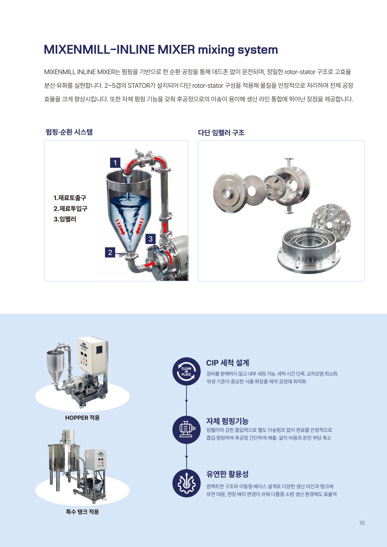 "PUMPING과 순환"의 개념을 적용하여 다단의 ROTOR와 STATOR를 이용하여 분산 성능을 강화 수평형의 구조로 ROTOR와 STATOR가 2겹(STAGE)으로 되어 있어 분산 및 유화 효율이 뛰어남 다단의 ROTOR 미 STATOR를 통과한 물질들은 펌핑과 순환에 의한 분산을 반복하여 분산 및 유화 효율이 뛰어남 ROTOR와 STATOR가 자장 하부에 있어 비중이 무거운 물질을 분산 및 유화하는 경우에 더 탁월한 성능 ROTOR와 STATOR의 간극(clearance)을 국내는 물론 세계 최고 수준의 0.2mm로 적용 전단력이 대폭 향상되어 같은 RPM대비 2배 이상의 유화, 분산 효과 스페셜로 고분산이 필요한 경우에는 0.1mm의 간극도 가능 이는 고속회전에도 회전축의 떨림이 전혀 없다는 것을 의미 화장품, 제약, 식품 등의 유화 및 분산 공정에 널리 사용되고 있으며 액상에 파우더 투입이나 Pre-mixing에도 유용 작게는 Hopper를 연결해 순환방식으로 사용 크게는 저장탱크에 연결하여 순환방식으로 사용 수 ton에 달하는 큰 용량의 탱크에도 설치가 가능 초대형 반응기 등 대형공정에도 적용 식품 쪽에서 주로 사용하는 부드러운 재료의 미세한 분쇄와 첨가물의 용해, 혼합 등에 특히 뛰어난 성능 실험용에서부터 생산용까지 다양한 스케일의 장비가 구비 호환이 가능한 ROTOR-STATOR, 메카니컬 씰, HOPPER 등의 임펠러 및 악세사리를 제공