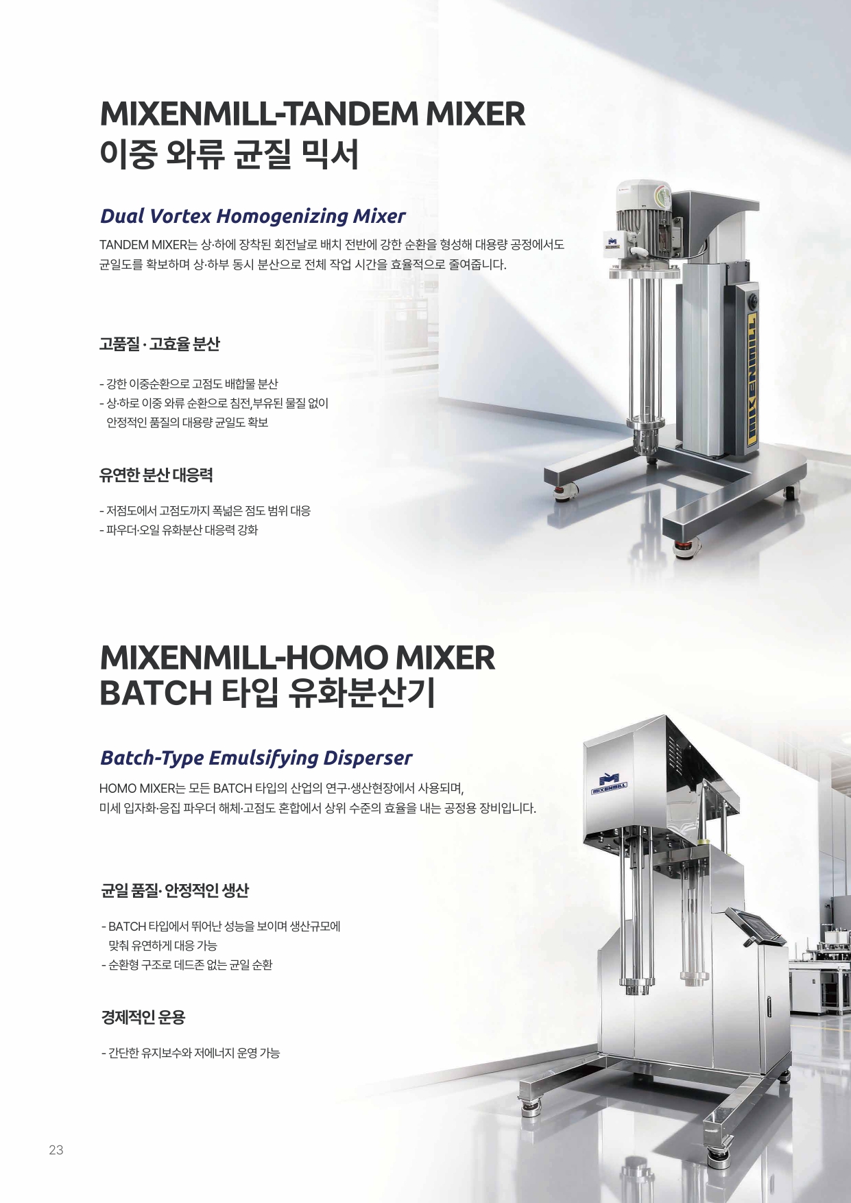 HOMO MIXER와 핵심 구동 원리는 비슷하지만 특수용도에 맞춰 UP-GRADE된 구조 위, 아래, 양 방향으로 강력한 와류가 형성되어 원료를 위, 아래로 흡입하여 강력 분산 후 옆으로 배출 액상 표면에 부유하는 비중이 가벼운 파우더와 오일류의 유화 및 분산 투입된 원료가 표면에 부유할 틈 없이 IMPELLER로 흡입되어 상온에서의 분산이 가능 화장품, 제약, 식품, 화학 및 전자재료 등 다양한 분야의 유화 및 분산 공정에 널리 사용 오일류의 유화, CMC, 카보폴, GUM류 등의 용해에 최고의 성능 점도가 높은 액상 원료에 파우더를 투입하여 상온에서도 손쉽게 분산하는 등 뛰어난 성능 표면에 부유하는 원료로 인해 공정시간이 오래 걸리거나 용해, 유화, 분산 품질이 떨어지는 다양한 공정에 널리 사용 실험용부터 생산용까지 다양한 스케일의 장비가 구비 다양한 조건의 생산 현장에 적용할 수 있는 옵션이 마련되어 있어 더욱 폭 넓은 분야에 적용이 가능
