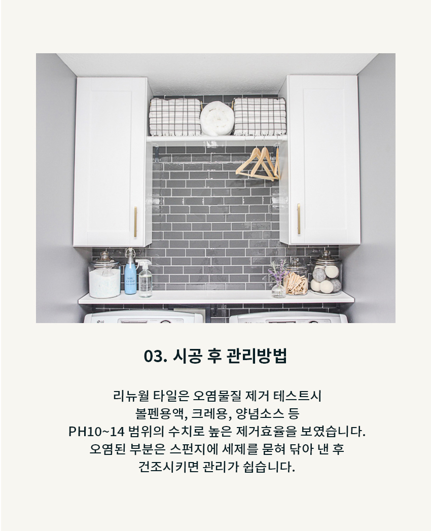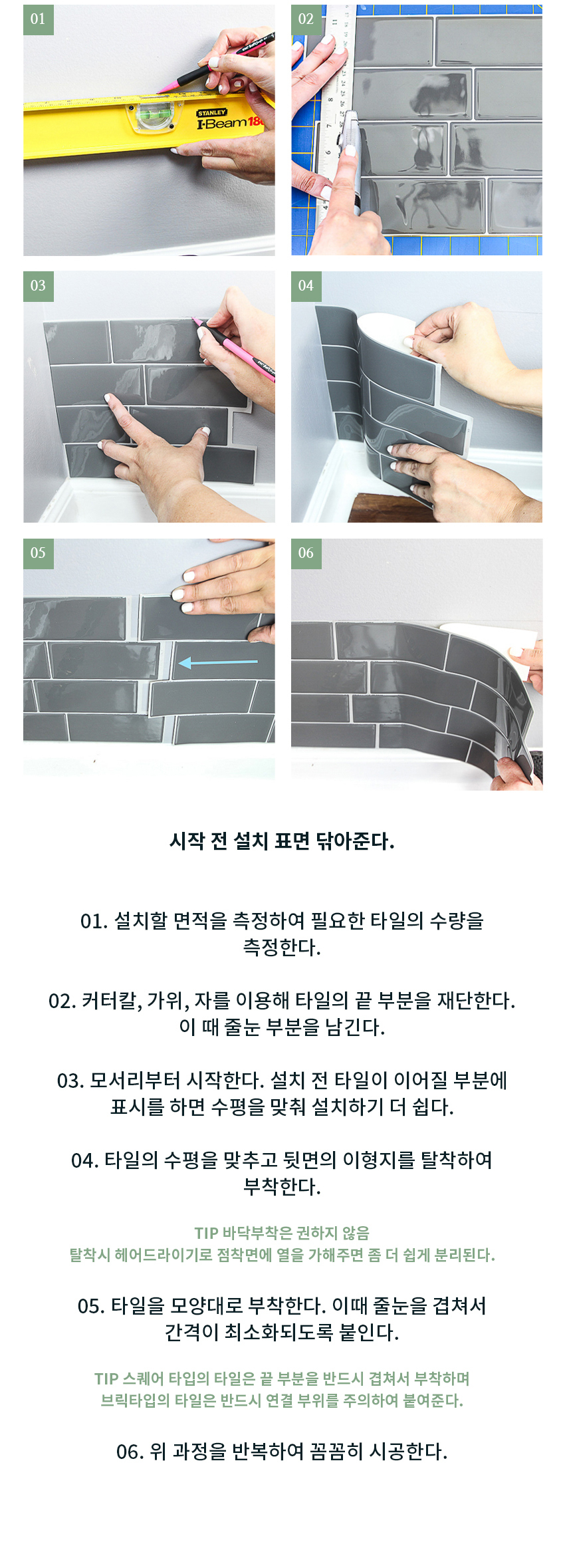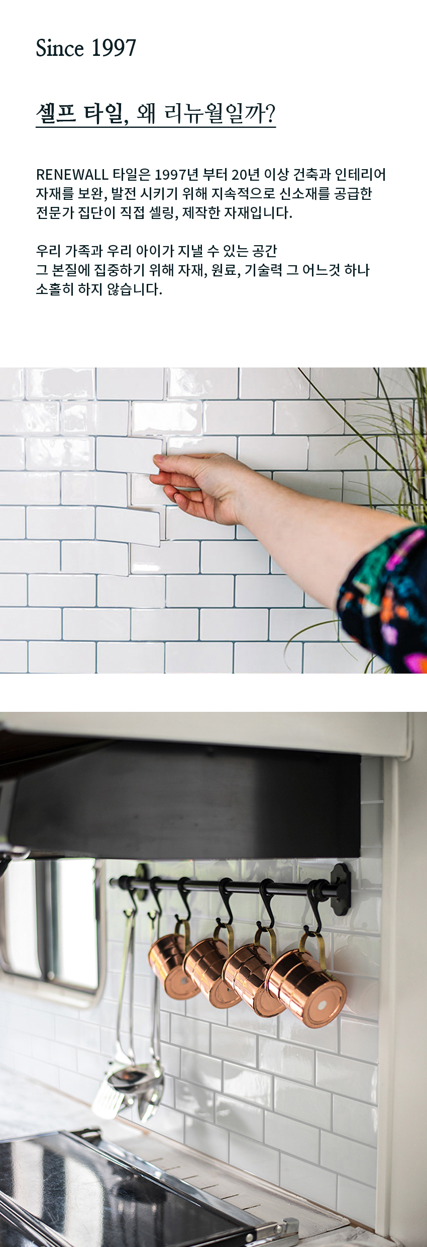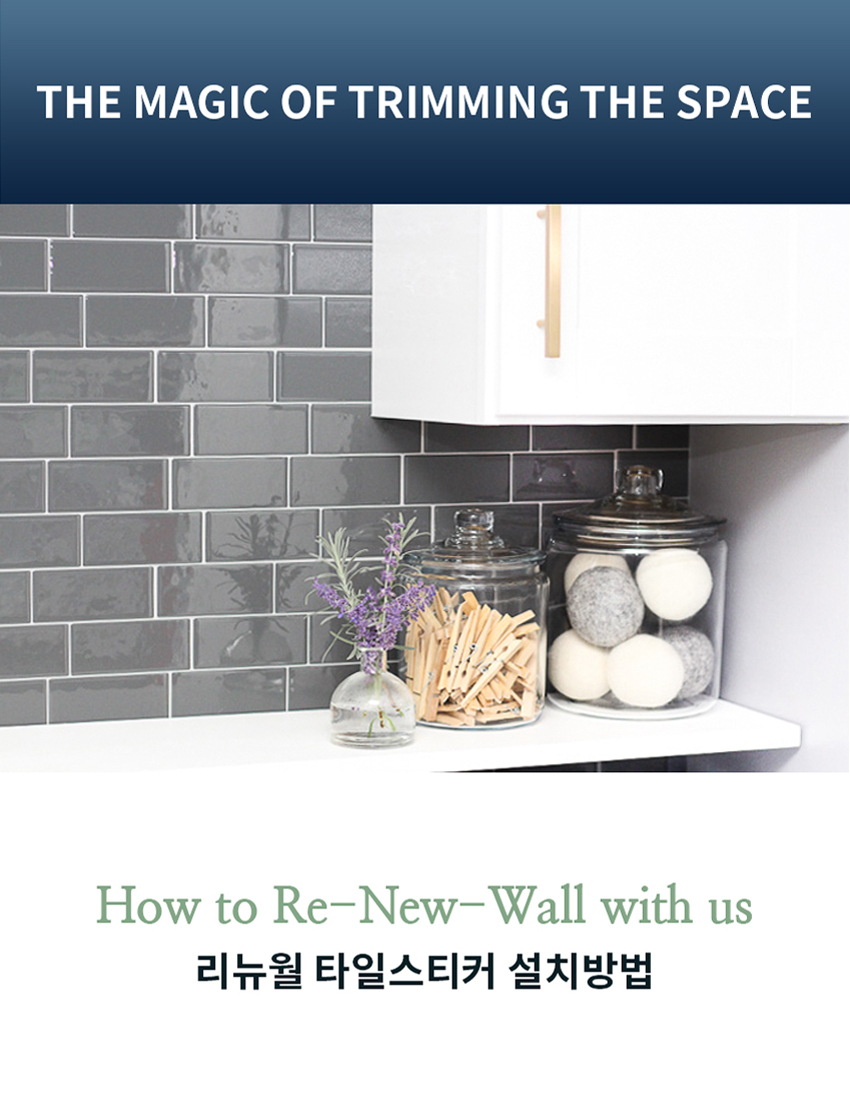 RENEWALL 타일 스티커 시공현장 ※기존 시트지는 제거 후 진행하는 것을 권장합니다. 총 걸린 시간 3시간 주방 타일 스티커 시공 주방 크기 3.125m2 RST-501하엘린(그레이)