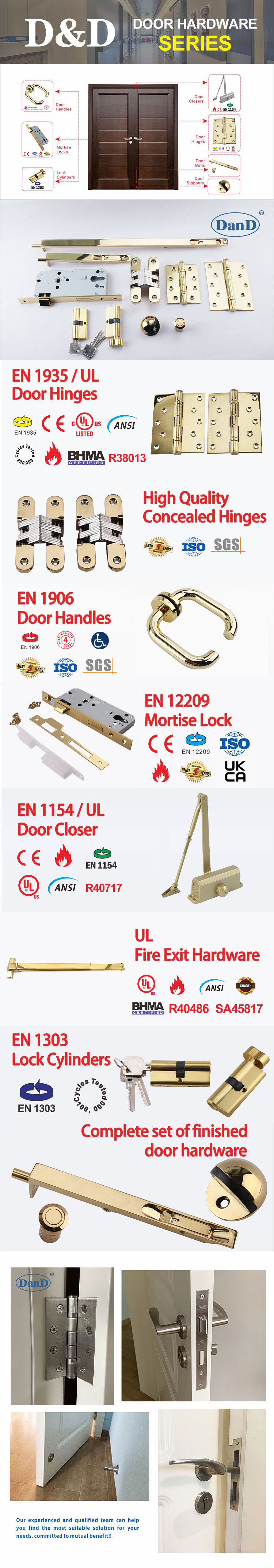 D&D Architectural door hardware can be divided into architectural door locks, door handles, door hinges, door closers, panic exit deivce, etc. According to their use, door hardware is an indispensable part of home decoration, from the safety of the family to the normal use of the furnishings in the living room. Quality hardware is not only the embodiment of exquisite craftsmanship, it is also a great decorative accessory to create a high quality home life.