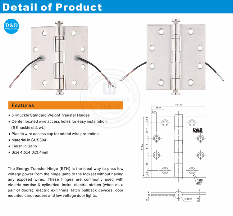 High Quality Hardware Safety Stainless Steel Electric Transfer Door Hinge