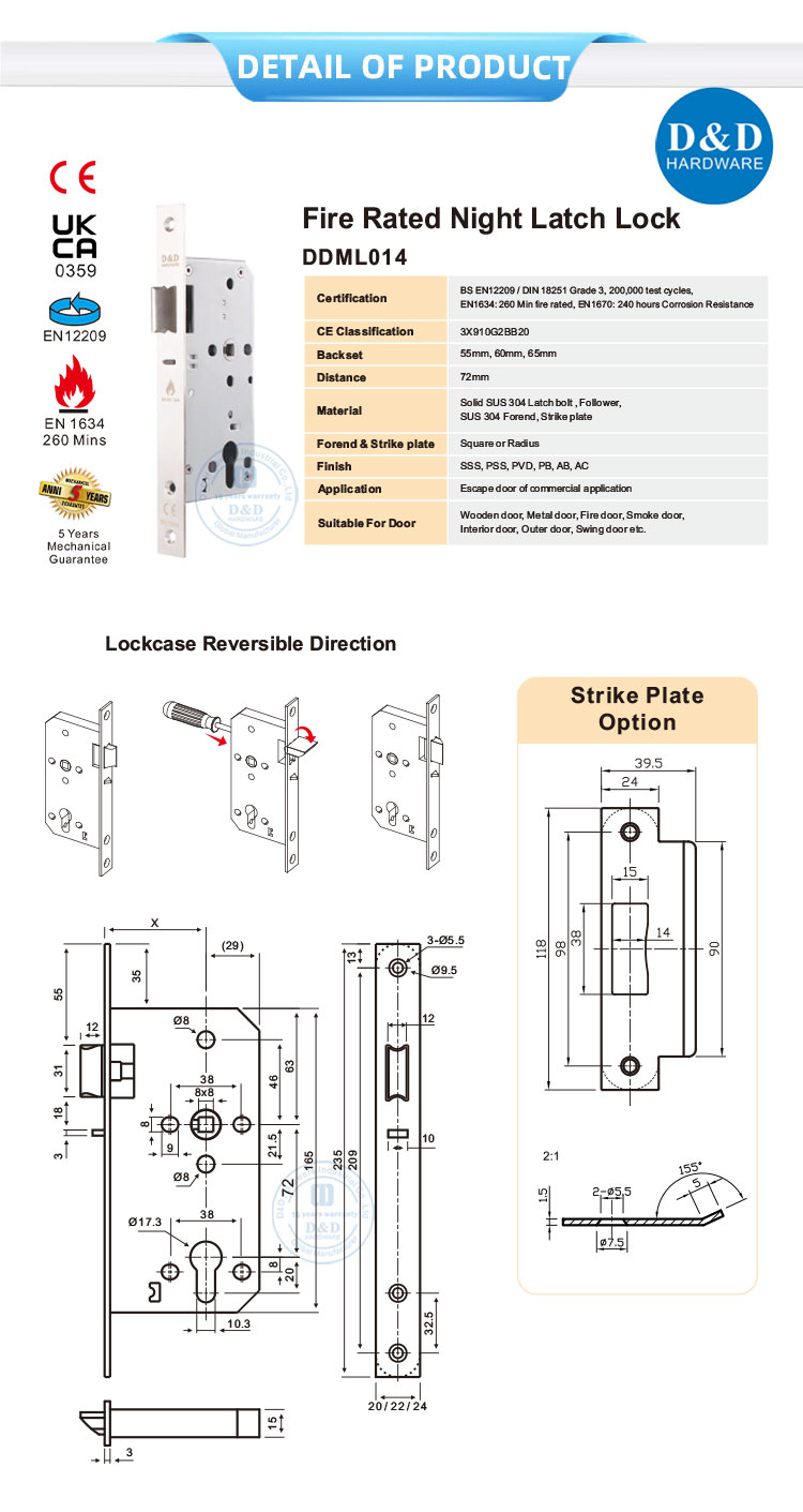 Night Latch Mortise Lockbody Lock CE EN12209 Grade 3 and Fire Rated EN1634 for Metal Door Wooden Door