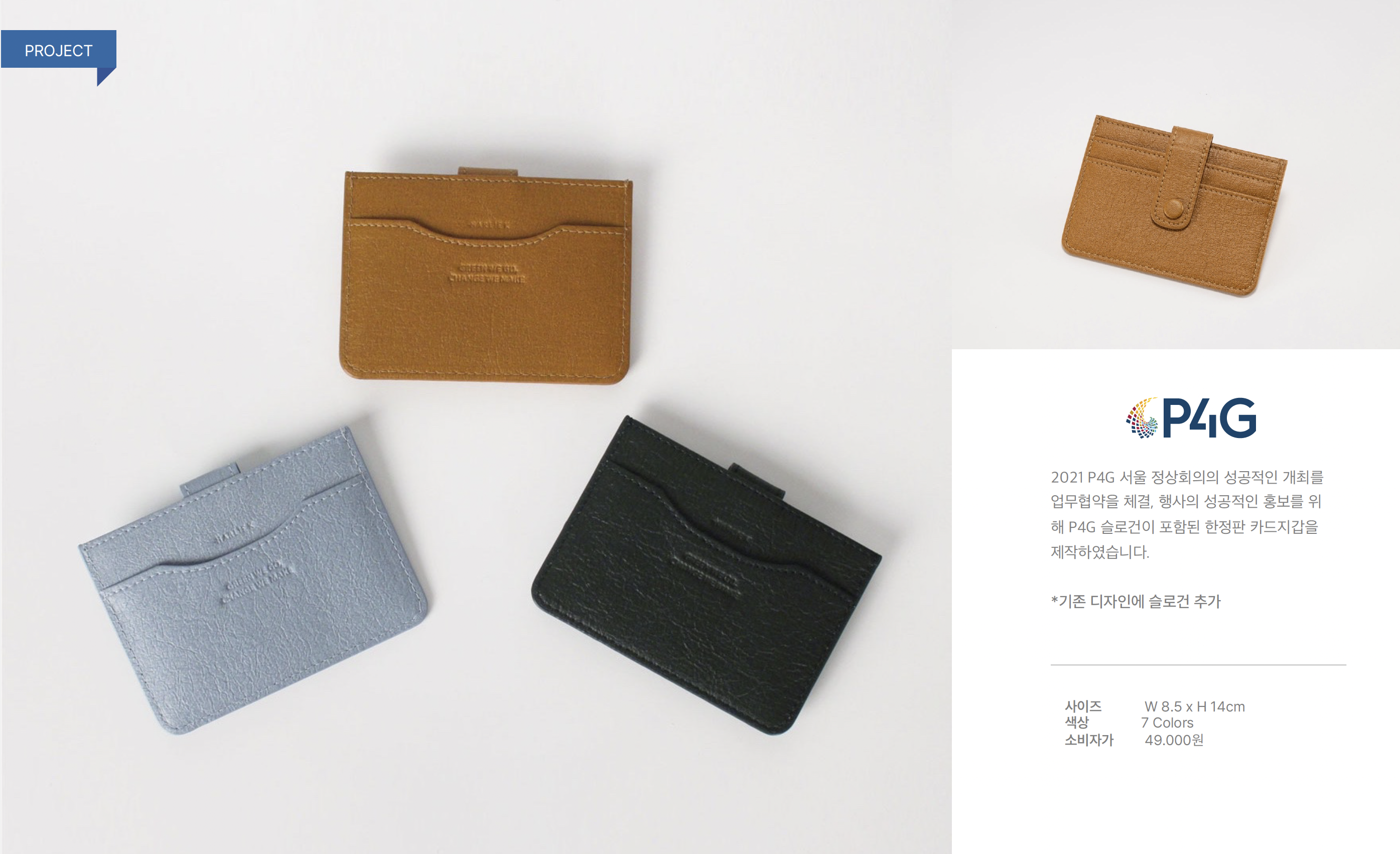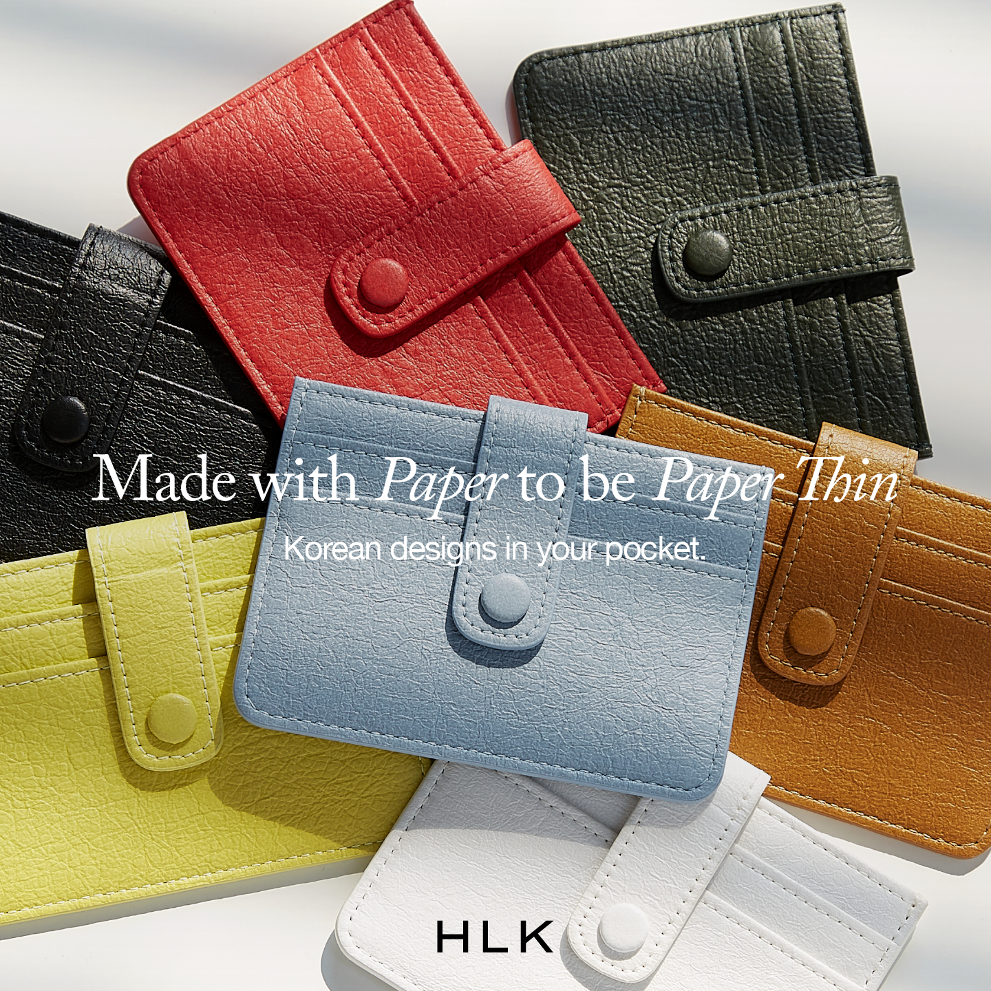 총 4개의 수납공간이 있어 즐겨 사용하는 카드를 수납하기에 편리하며, 똑딱이 버튼이 있어 안전하게 카드를 수납할 수 있다는 장점이 있습니다. 비건 한지가죽의 소재 특성상 물을 흡수하지 않아 생활 방수에 강합니다. 또한 내구성이 좋아 형태가 매우 단단하며 외부 스크래치에 강한 것이 특징입니다. 27g의 놀라운 가벼움으로 어디에서나 무리 없이 들고 다닐 수 있으며 총 7가지 컬러로 구성되어있으며