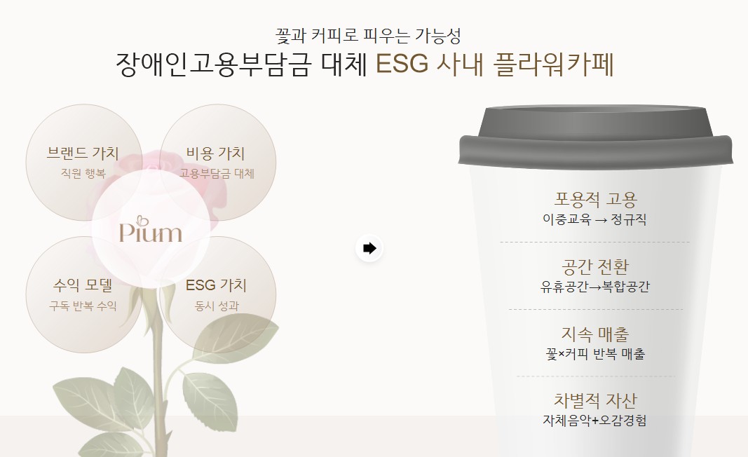 - 기업내 유휴공간에 장애인 고용을 기반으로 한 ESG 사내 플라워&카페를 설치 및 운영 서비스 제공함.